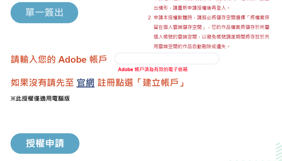 請務必持有Adoble ID (請用原來的個人ID,若不曾申請過,請至ADOBE官網https://account.adobe.com/ 申請後才能繼續申請授權)