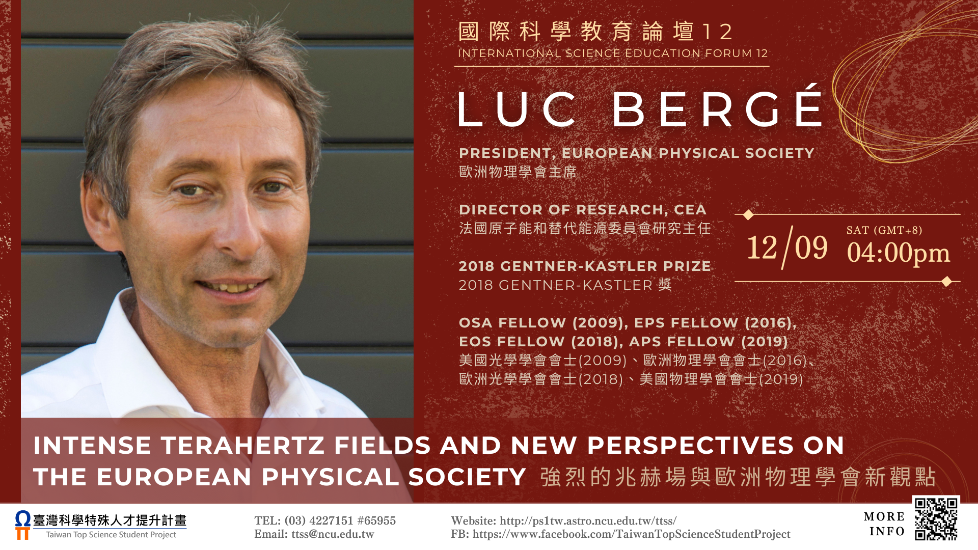 一、Dr. Luc Bergé 是一名法國原子能和替代能源委員會的理論物理學家。他的成就明確地顯示,他是非線性波傳播、飛秒雷射絲化、太赫茲脈衝生成及相關應用領域的世界級先鋒和領導者。他同時是歐洲物理學會主席、法國原子能和替代能源委員會研究主任,這次他以「Intenseterahertz fields and new perspectives on the European Physical Society」主講,內容將涵蓋兆赫場研究及歐洲物理學會對歐洲物理教育的一些新觀點。