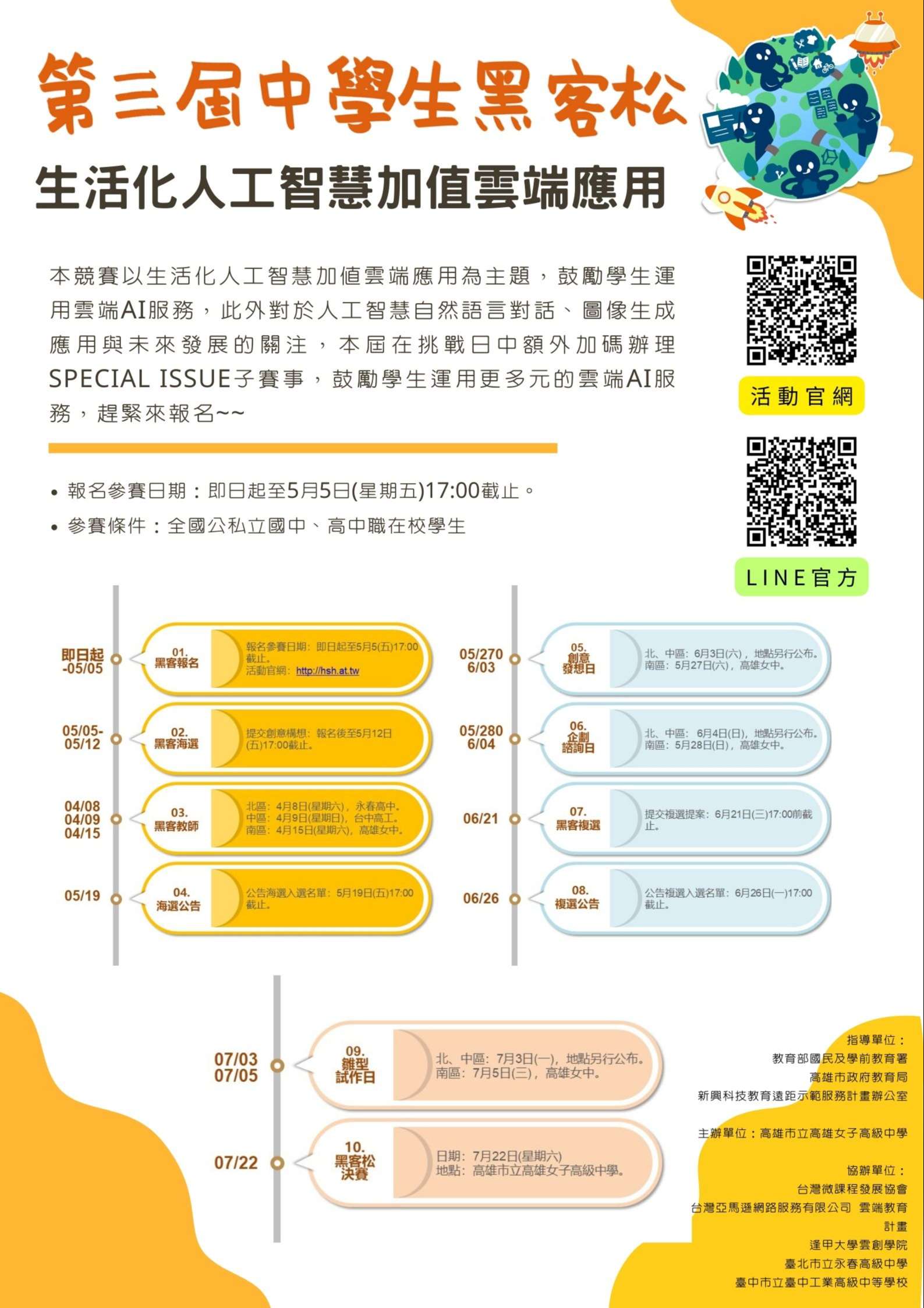 四、詳細活動時程請參閱競賽官網:http://hsh.at.tw,如有相關問題,請至本活動之LINE官方帳號詢問。
