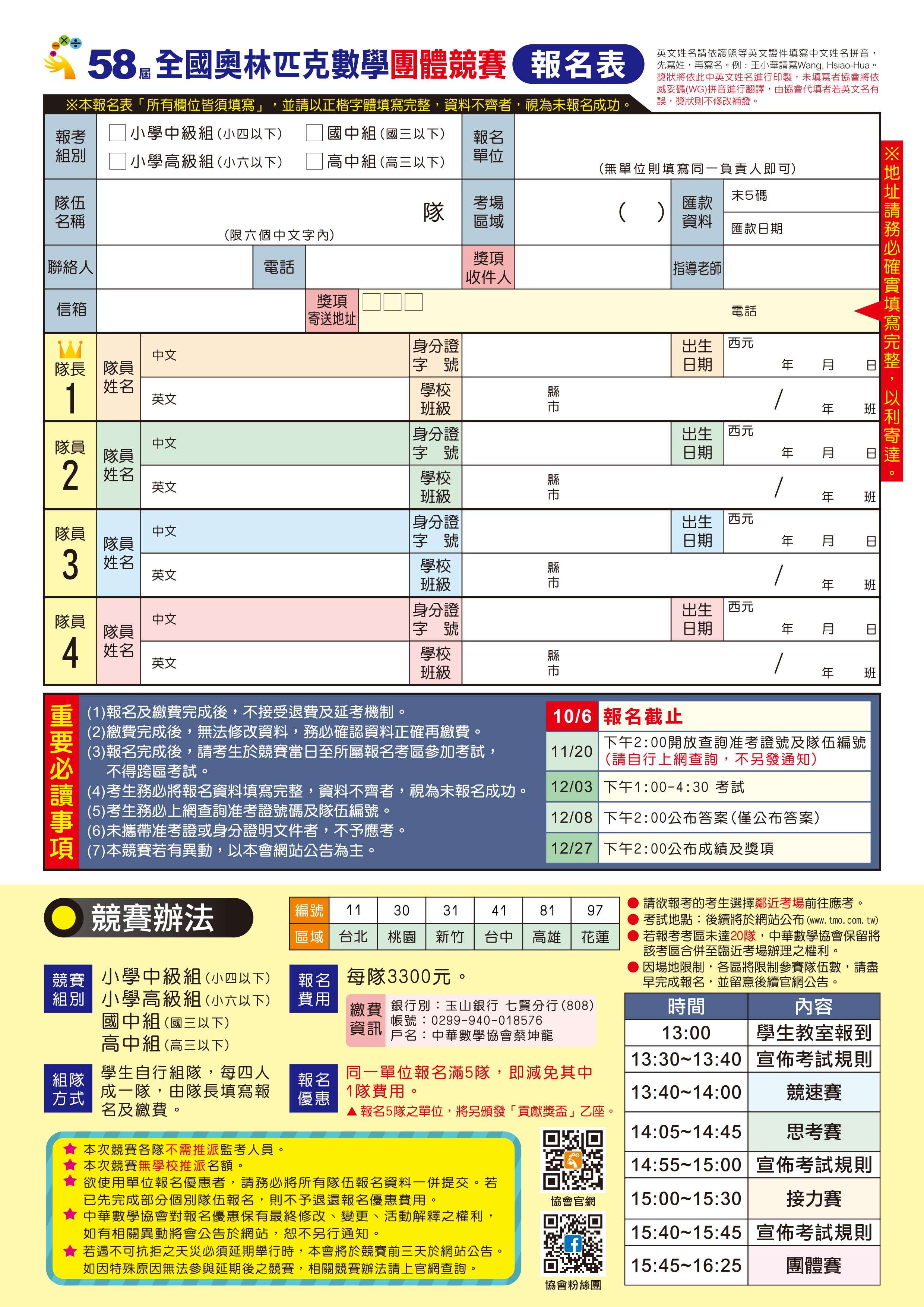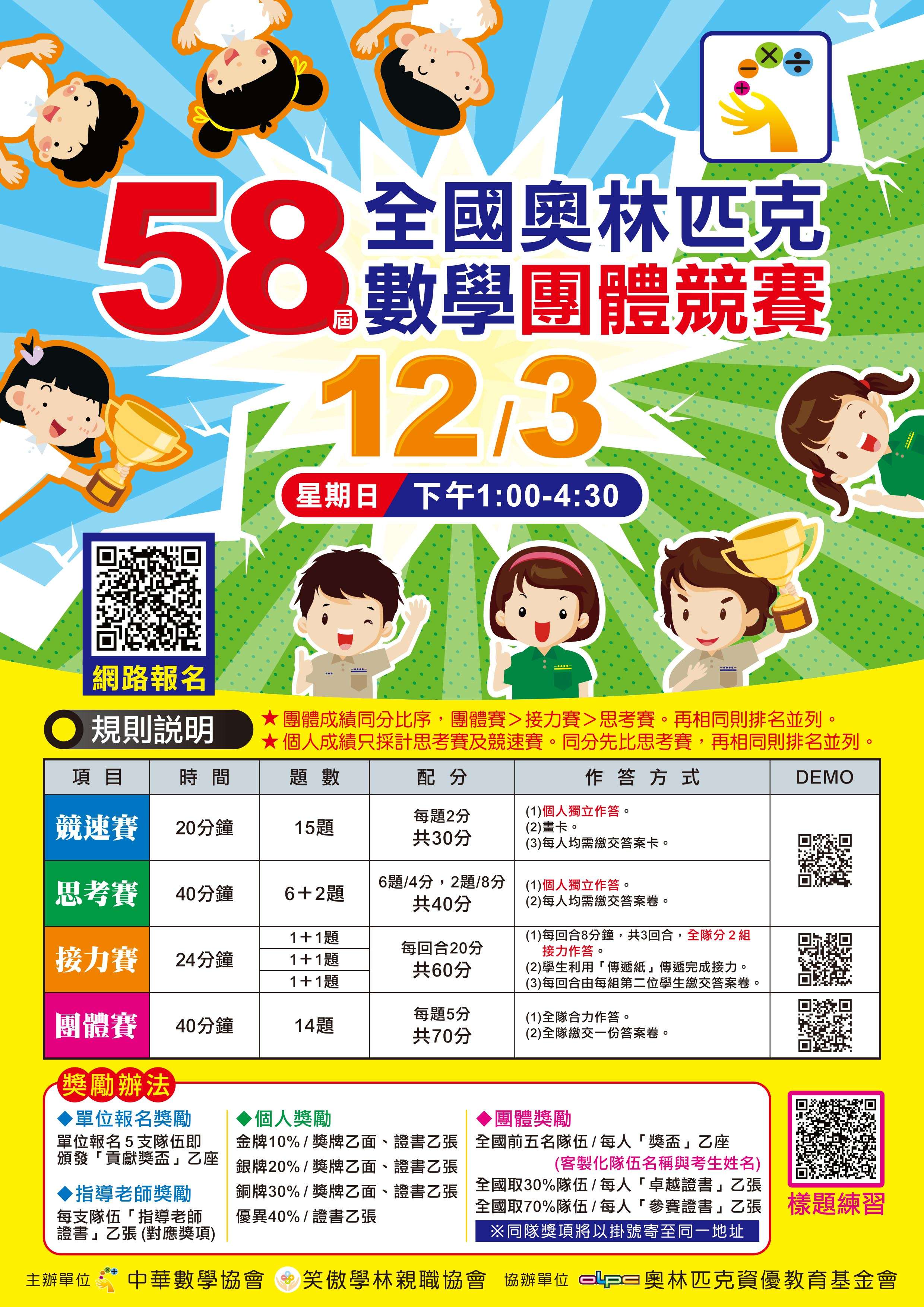 二、檢附「第58屆全國奧林匹克數學團體競賽」競賽活動簡章,供 參閱。