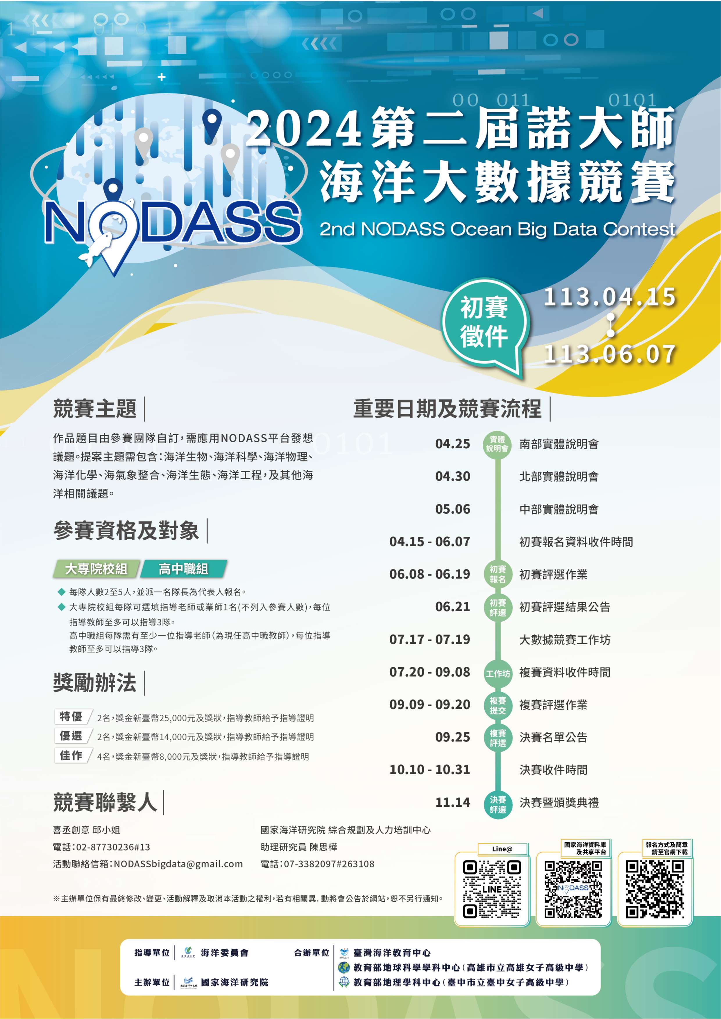 一、本院辦理「2024第二屆-諾大師海洋大數據競賽」,以「NODASS海洋大數據」為主題,邀請大專院校學生(含碩博士、在職專班及師培生)及高中職學生組隊,透過團隊合作研擬創新提案及參與競賽,期許培育以海洋大數據為基礎之探究與實作人才,並持續推動打造海洋素養典範國家之目標。