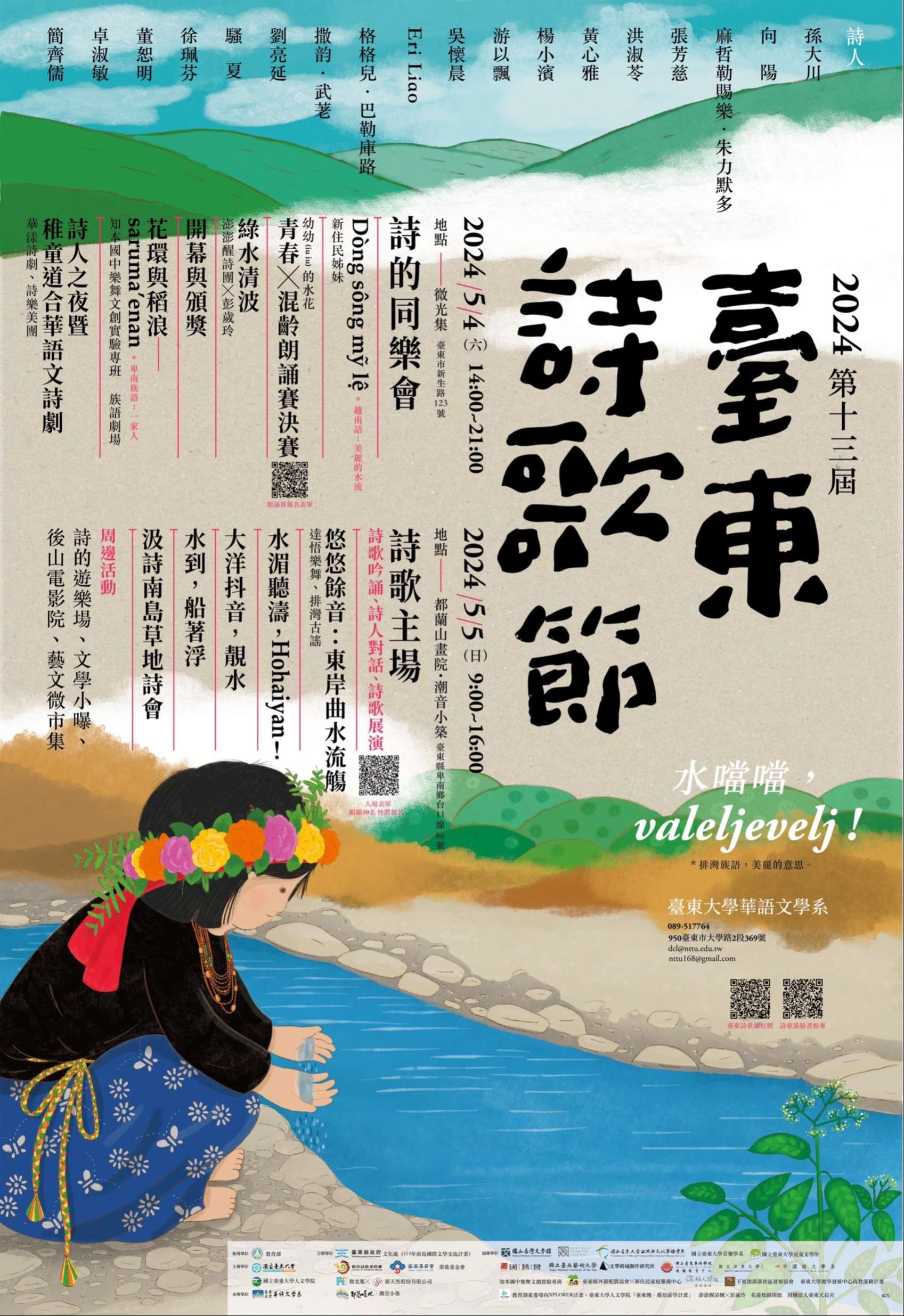 一、臺東詩歌節今年以「水噹噹,valeljevelj!」為題,從臺東╱臺灣出發,連結世界南島民族文學家,在族群多元、文化多彩、語言繽紛、風土靚秀、人情真媠的「臺東」,以詩歌的對談、展演與再製等多重表現形式,詮釋與流佈南島人文風華。