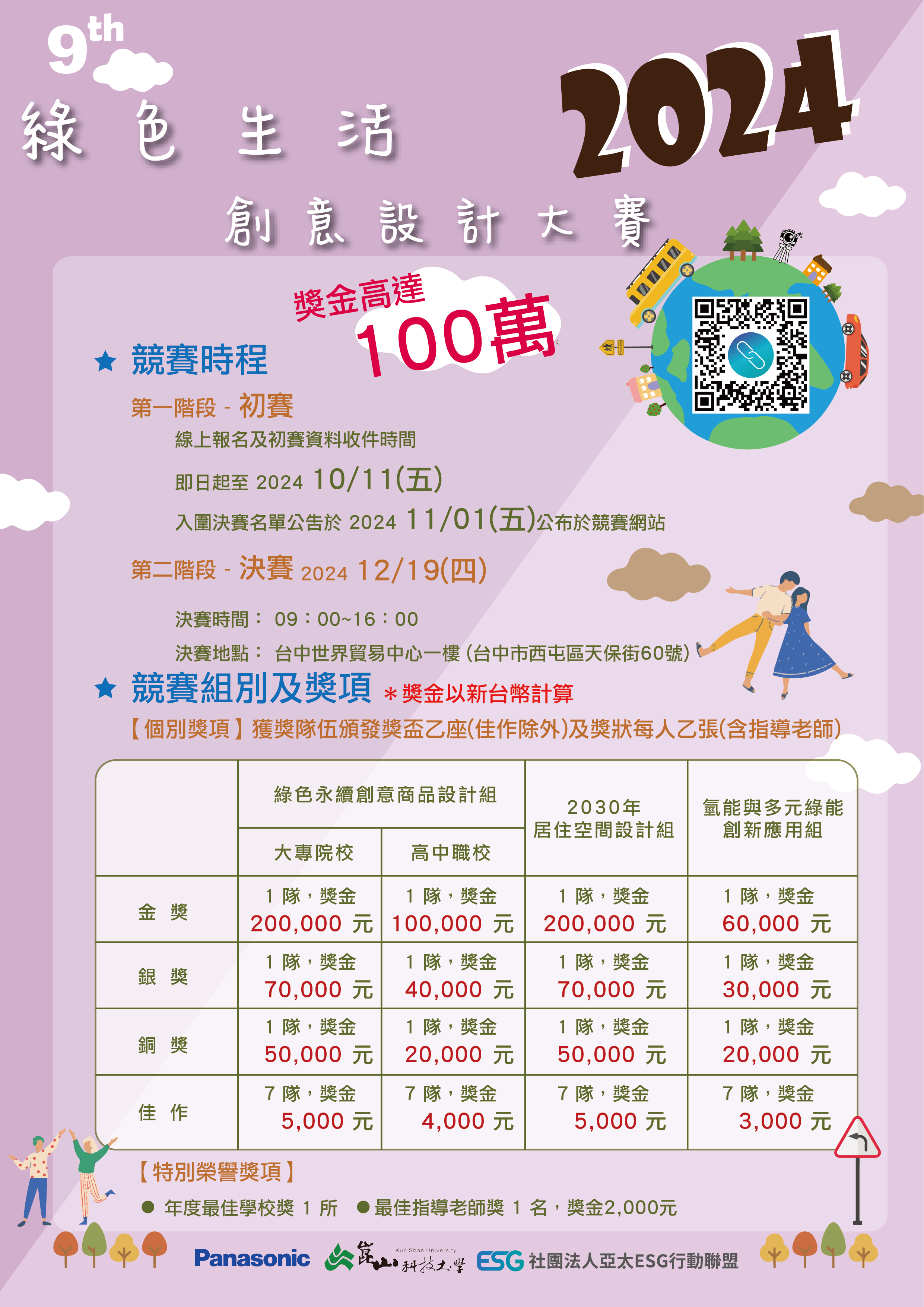一、台灣Panasonic集團自2015年開始每年定期舉辦「綠色生活創意設計大賽」。今年本校將延續前八屆精神,舉辦「第九屆2024 綠色生活創意設計大賽」,旨在啟發學子們對「淨零碳排與智慧低碳生活」的重要性,共同追求永續發展。