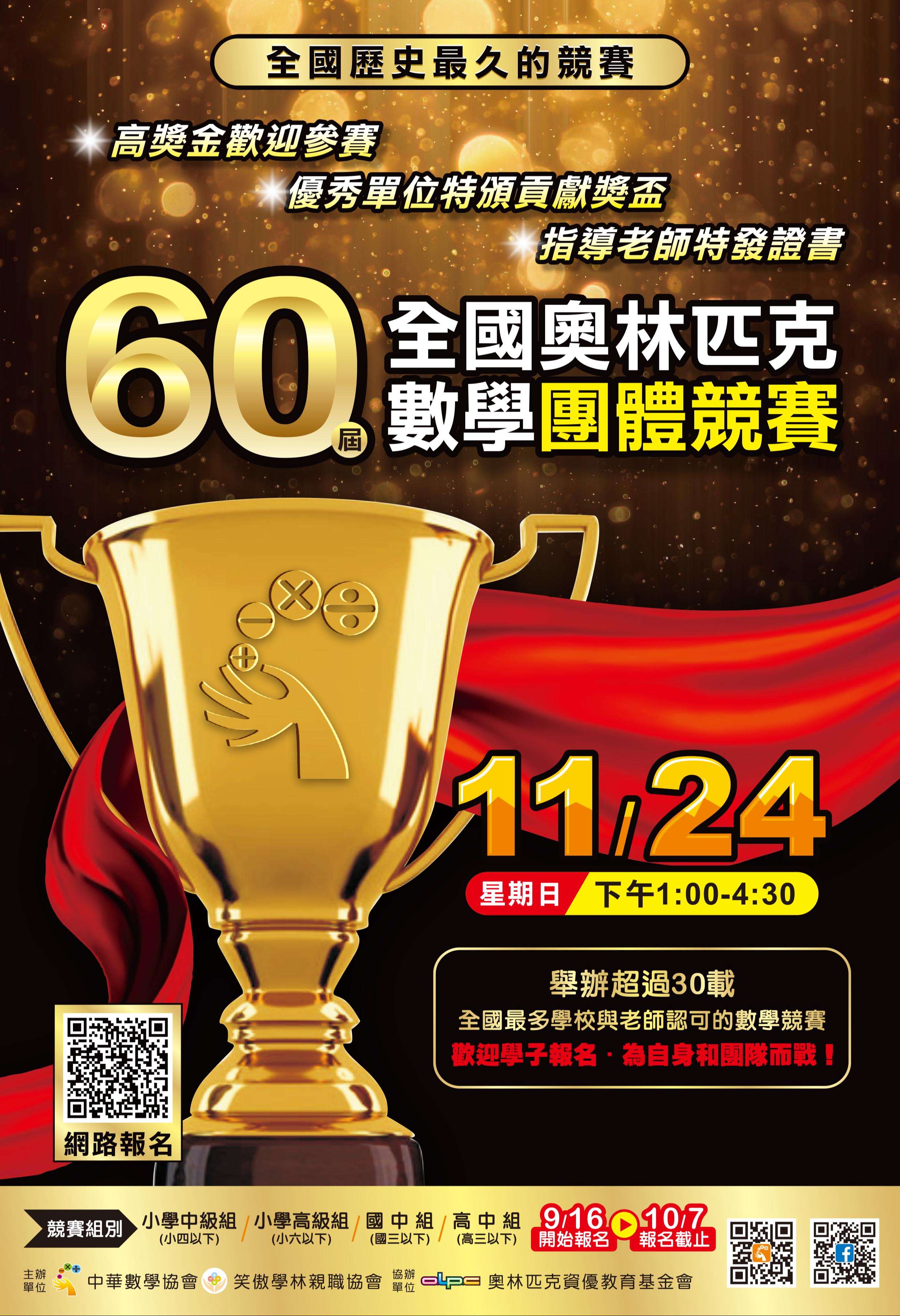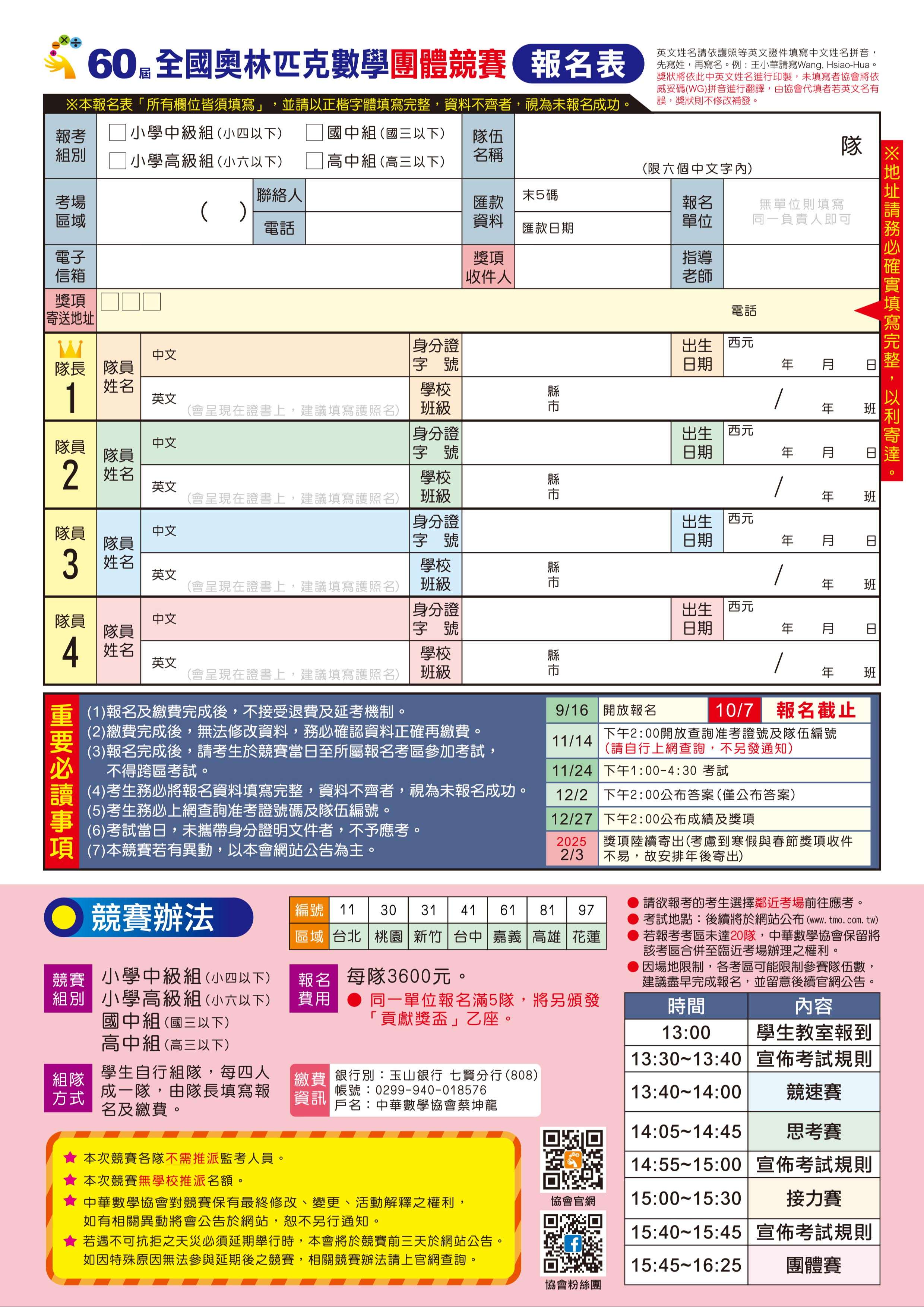 二、檢附「第60屆全國奧林匹克數學團體競賽」競賽活動相關簡章,供 貴校參閱。競賽報名的起訖時間為113年9月16日至113年10月7日止。