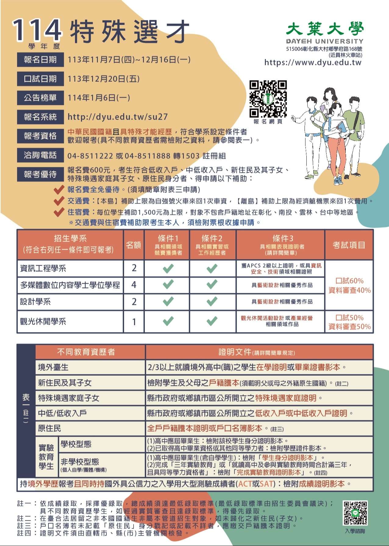 五、各系報考資格,請參閱招生文宣並詳閱招生簡章資訊。考生符合「低收入戶、中低收入戶、新住民及其子女、特殊境遇家庭子女或原住民身分者」,本校另有免報名費或交通與住宿費之補助,敬請師長踴躍推薦所屬學生報考。