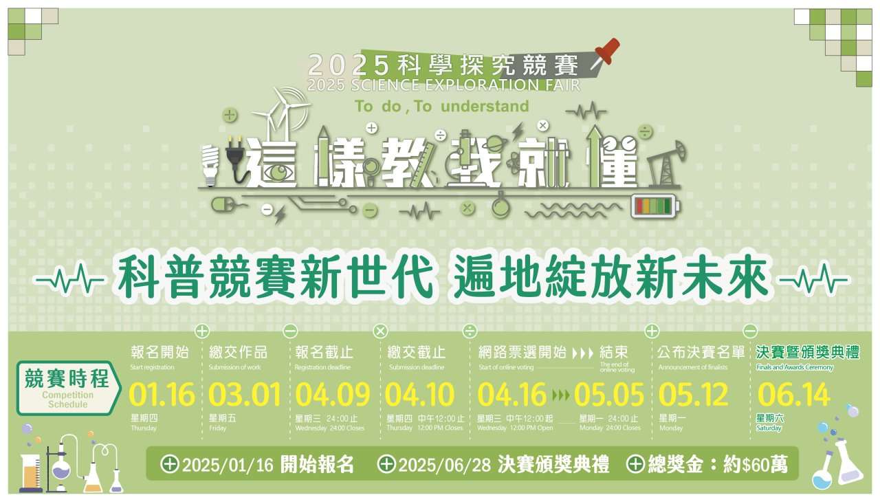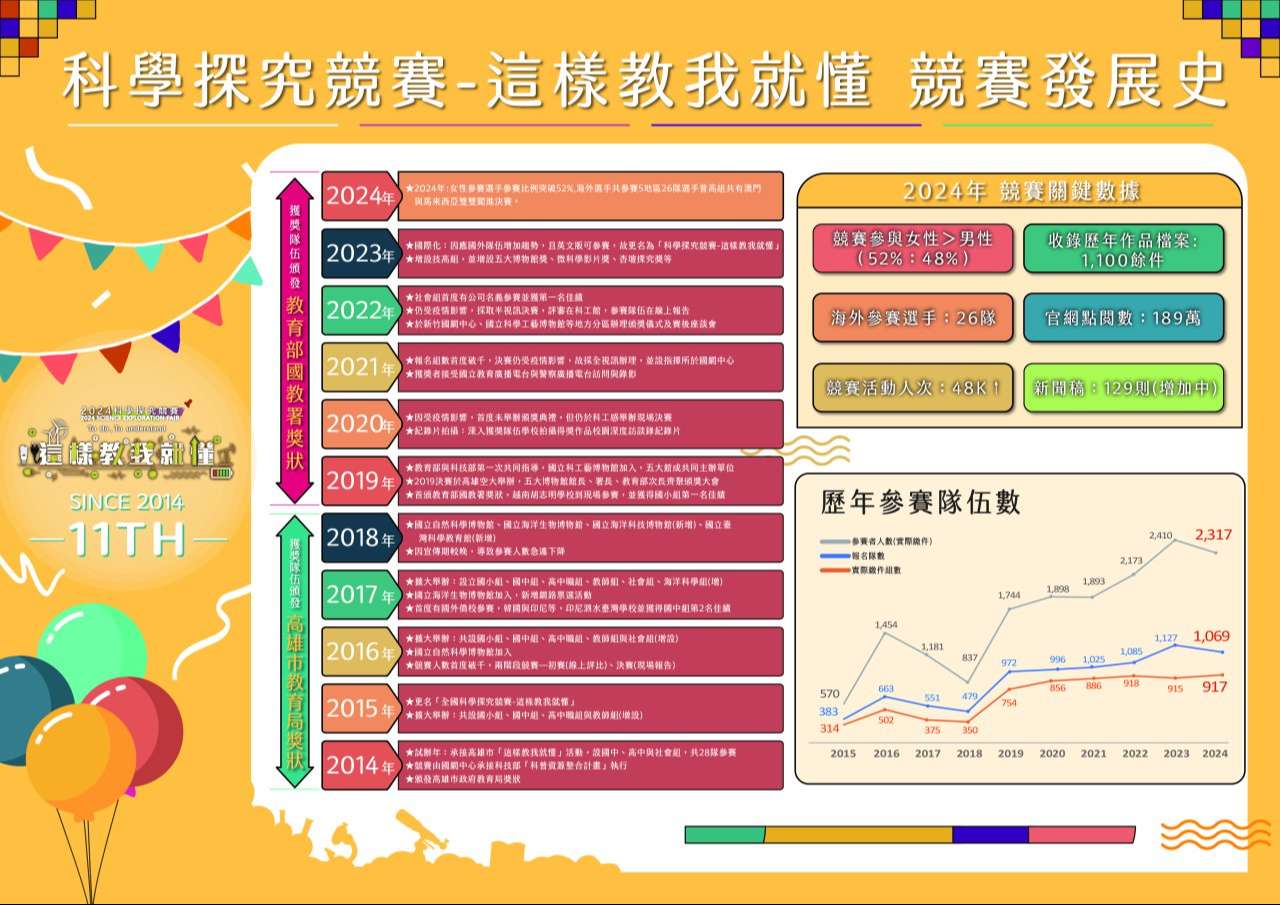 一、本競賽由國教署指導,並由國立高雄師範大學、國立臺灣師範大學、國研院國網中心、國立自然科學博物館、國立臺灣科學教育館、國立科學工藝博物館、國立海洋生物博物館及國立海洋科技博物館共同辦理,邀請對科學有興趣之師生,透過科學問題發想、資料收集與理解、探究及表達,以科學的角度解答來解決生活議題,培養科學敘事能力。