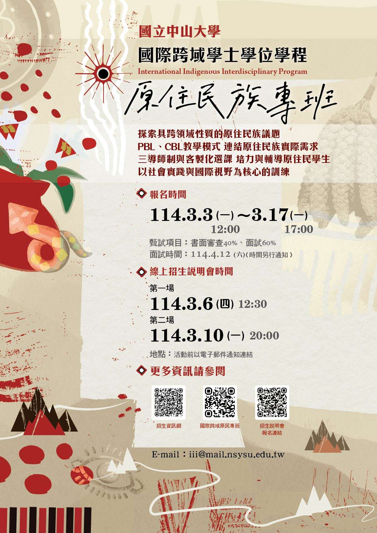 轉知-國立中山大學114學年度「國際跨域學士學位學程原住民族專班」招資訊。