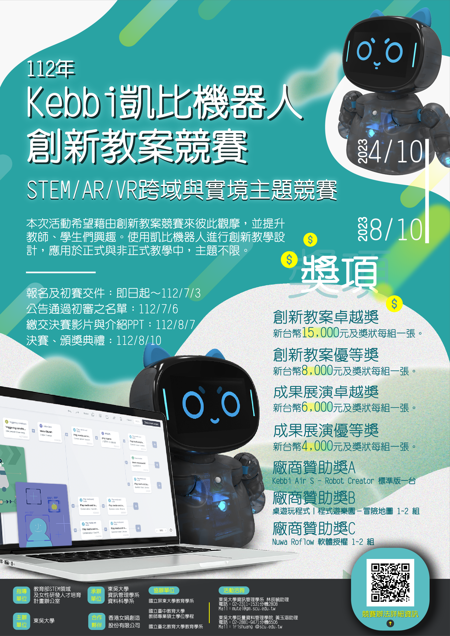 一、為提升教師、學生們對AI教育興趣,藉由使用AI School App配合凱比機器人為基礎,發想創新教案。東吳大學資訊管理學系、資料科學系與國立屏東大學教育學系、國立臺中教育大學教師專業碩士學位學程、 國立臺北教育大學教育學系共同規劃,舉辦「STEM/AR/VR 跨域與實境主題競賽112年Kebbi凱比機器人創新教案競賽」。