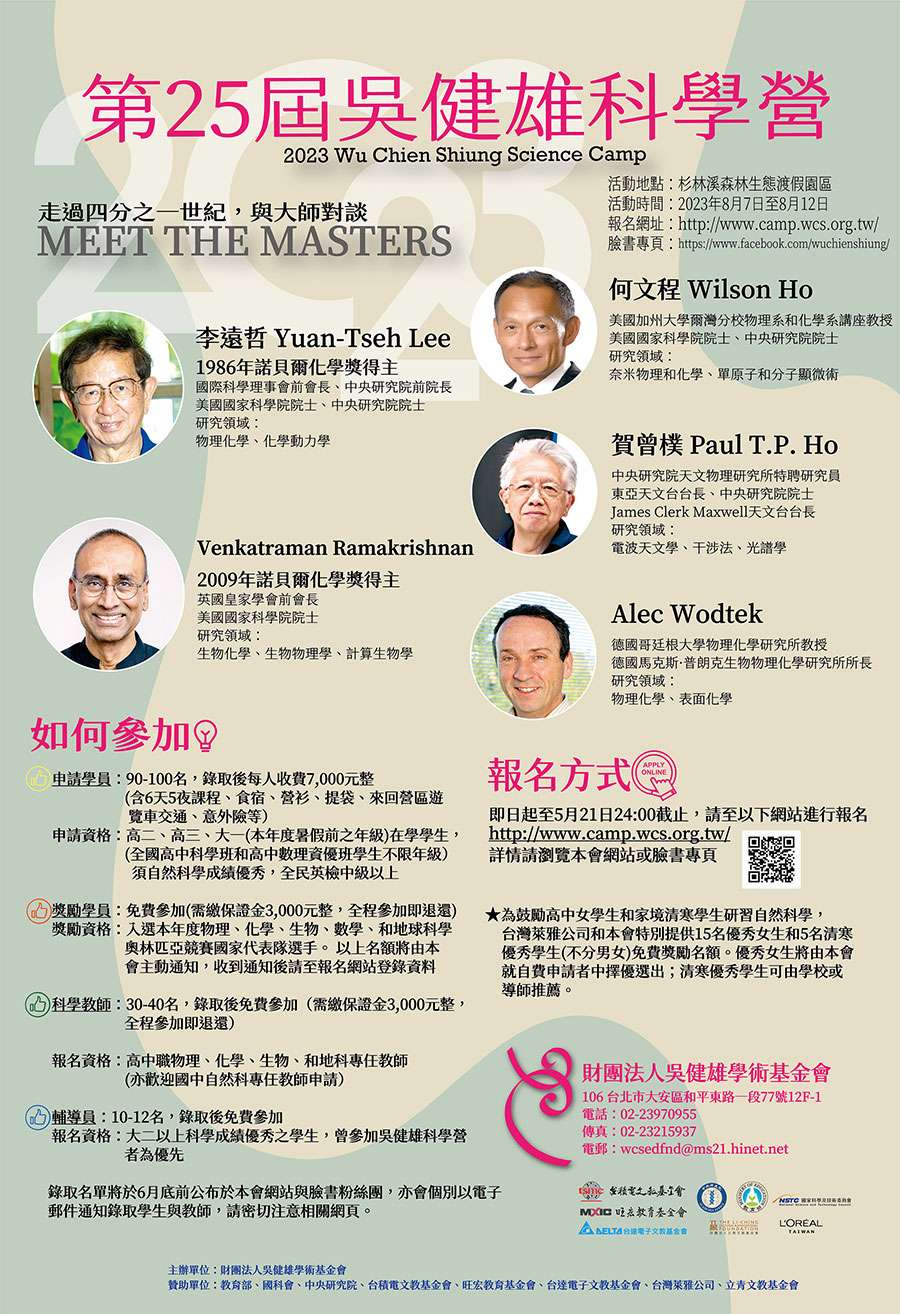 - 報名資格:大二以上自然科學成績優秀、英文程度良好之學生,曾參加過吳健雄科學營者為優先。