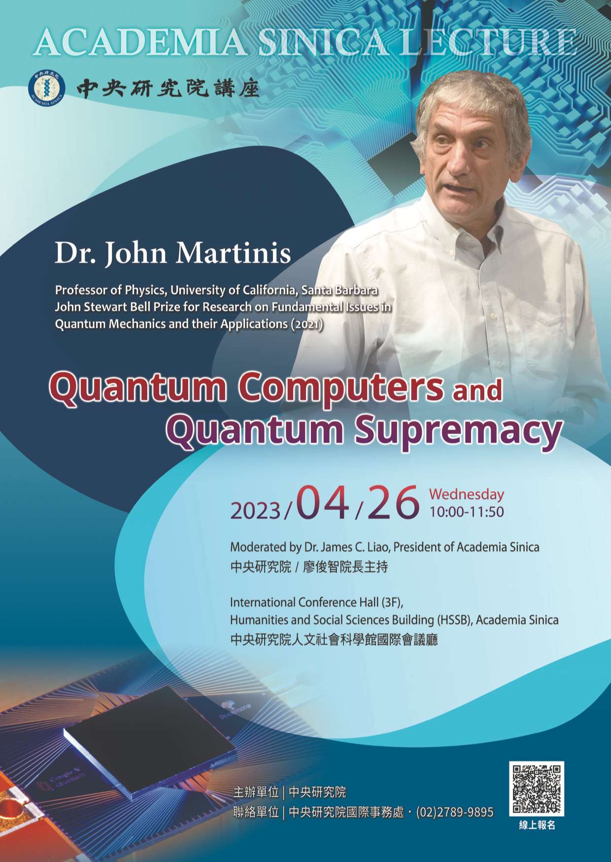 三、演講資訊如下: (一)講題:「量子電腦與量子霸權」(Quantum Computers and Quantum Supremacy) (二)時間:2023年4月26日(星期三)上午10時至11時50分 (三)地點:中央研究院人文社會科學館三樓國際會議廳(臺 北市南港區研究院路二段128號) (四)檢送演講活動電子海報檔1份。線上報名網址: https:// forms.gle/91SKgWbsDyeiLmAP6,洽詢專線: 本院國際事務處,(02)2789-9895。