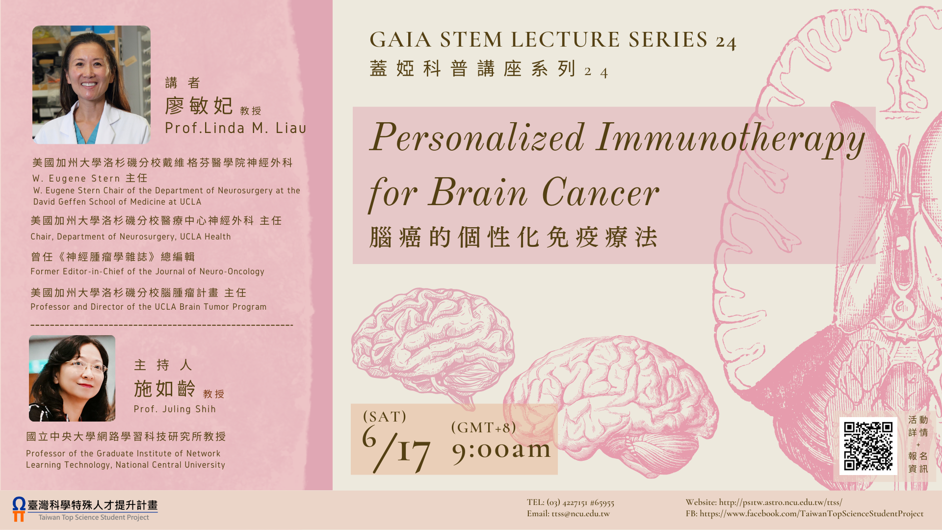 二、《蓋婭科普講座系列24》活動訊息如下: (一)講者:廖敏妃教授(美國加州大學洛杉磯分校戴維·格芬 醫學院)。 (二)主持人:施如齡教授(國立中央大學網路學習科技研究 所)。 (三)主題:腦癌的個性化免疫療法(Personalized Immunotherapy for Brain Cancer)。 (四)時間:112年6月17日,上午9時(GMT+8)。
