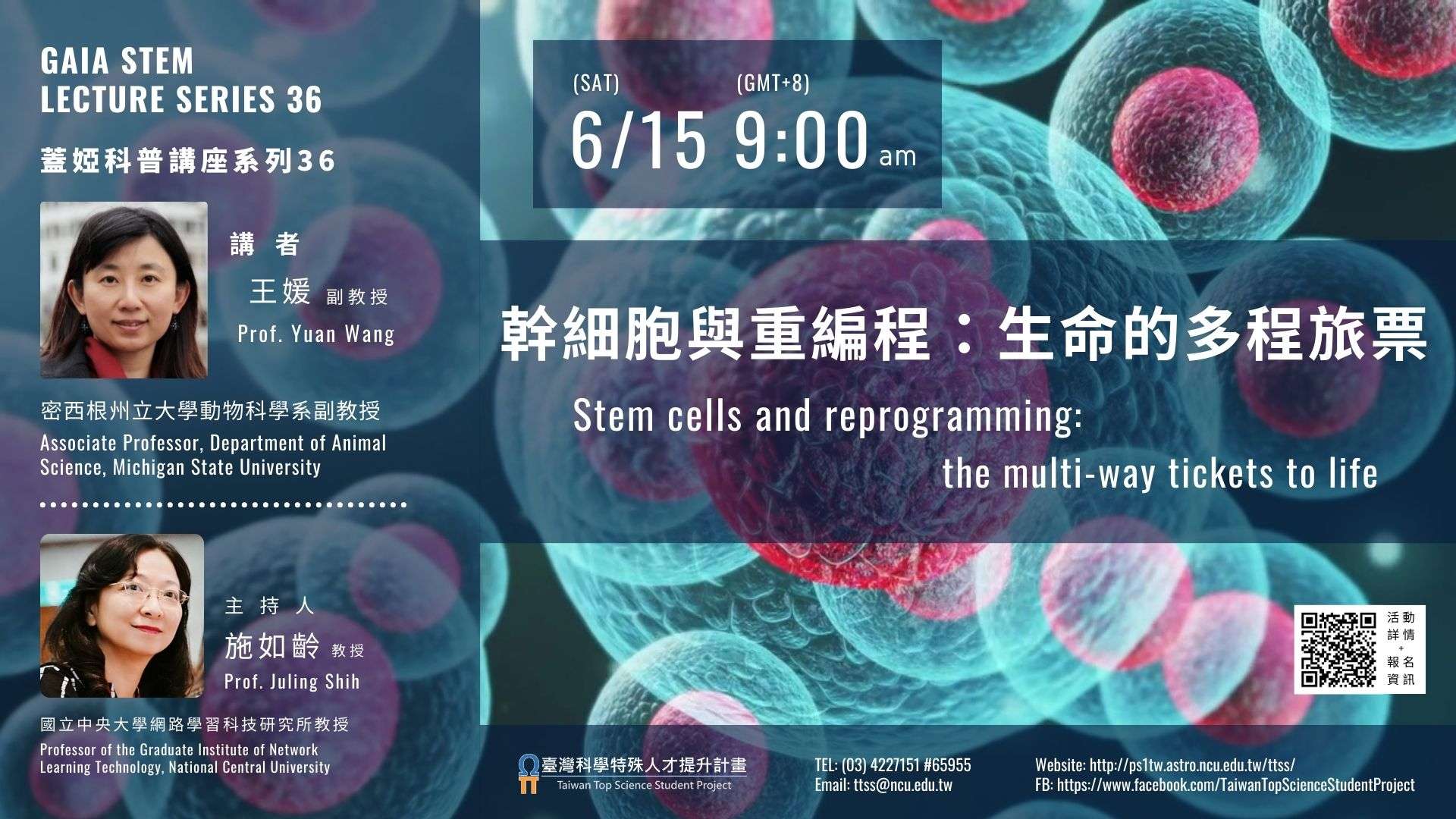 一、本次講座由密西根州立大學王媛副教授分享其對於幹細胞的研究,幹細胞具有能分化成身體各種細胞的潛能,透過研究幹細胞除了可以了解生命延續機制、生命週期,也有助於我們對不孕症的治療。