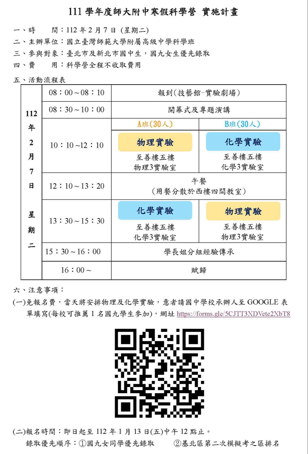 (一)免報名費(每校可推薦1名國九學生),當天將安排物理及化學實驗,有興趣參加之學生,請攜帶基北區第二次模擬考成績單(須有區排名及學校核章,報名系統上傳)於1/11(三)前至特教辦公室報名。