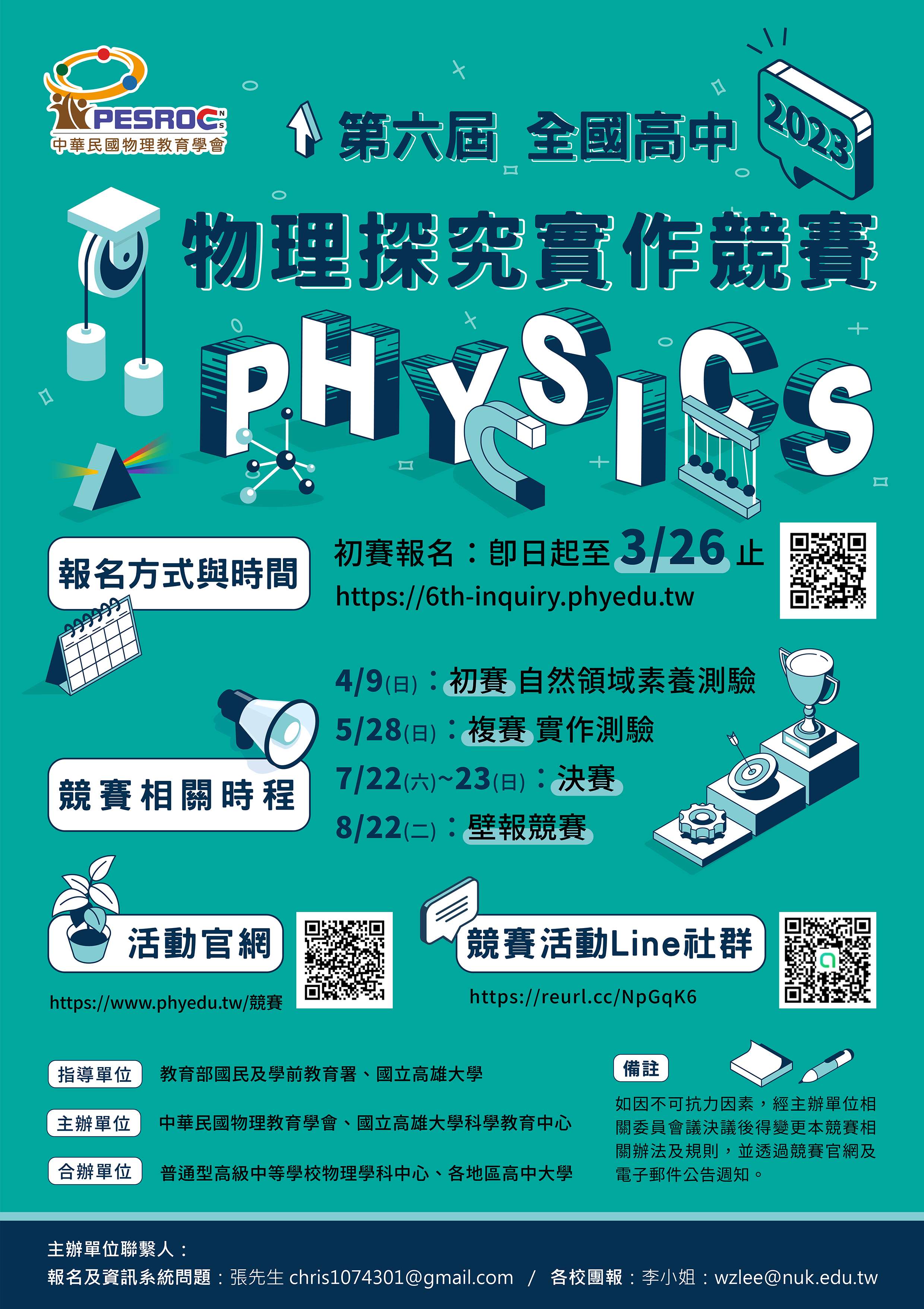 三、學生報名參賽時間至112年3月26日止,由學生自行上網報 名並繳款;如欲採團體報名,請填寫團體報名表單後寄至 聯絡人員信箱,繳款前請與與團體報名承辦人聯繫,確認 報名情形後再行繳款。 (一)活動官網:https://www.phyedu.tw/競賽/2023第六屆全 國高中物理探究實作競賽 (二)個人報名網頁:https://6th-inquiry.phyedu.tw (三)團體報名表單:https://reurl.cc/NGkMZx (四)Line社群:https://reurl.cc/NpGqK6