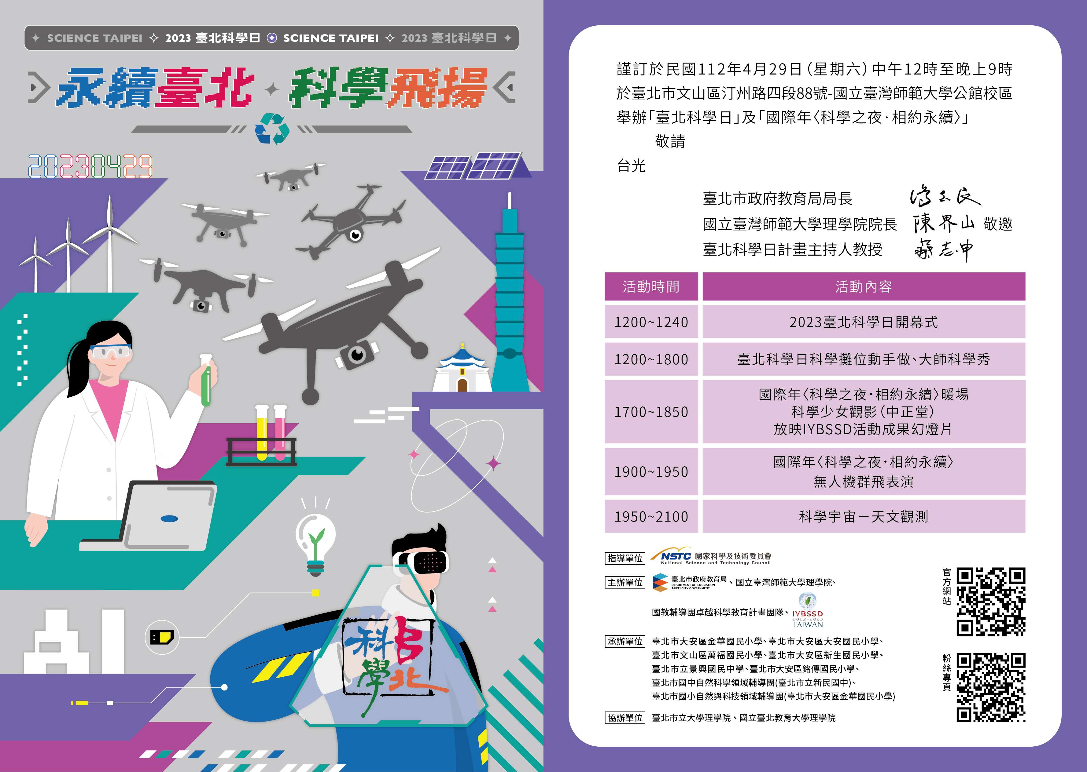 二、旨案係由本局與國立臺灣師範大學理學院物理學系合作舉 辦,本年度將於112年4月29日(星期六)假師大公館校區 辦理科學體驗實作活動,並響應聯合國教育科學及文化組 織「基礎科學促進永續發展國際年」理念,藉本活動「永 續臺北—科學飛揚」之主題,彰顯本市對於推動科學教育 的重視。