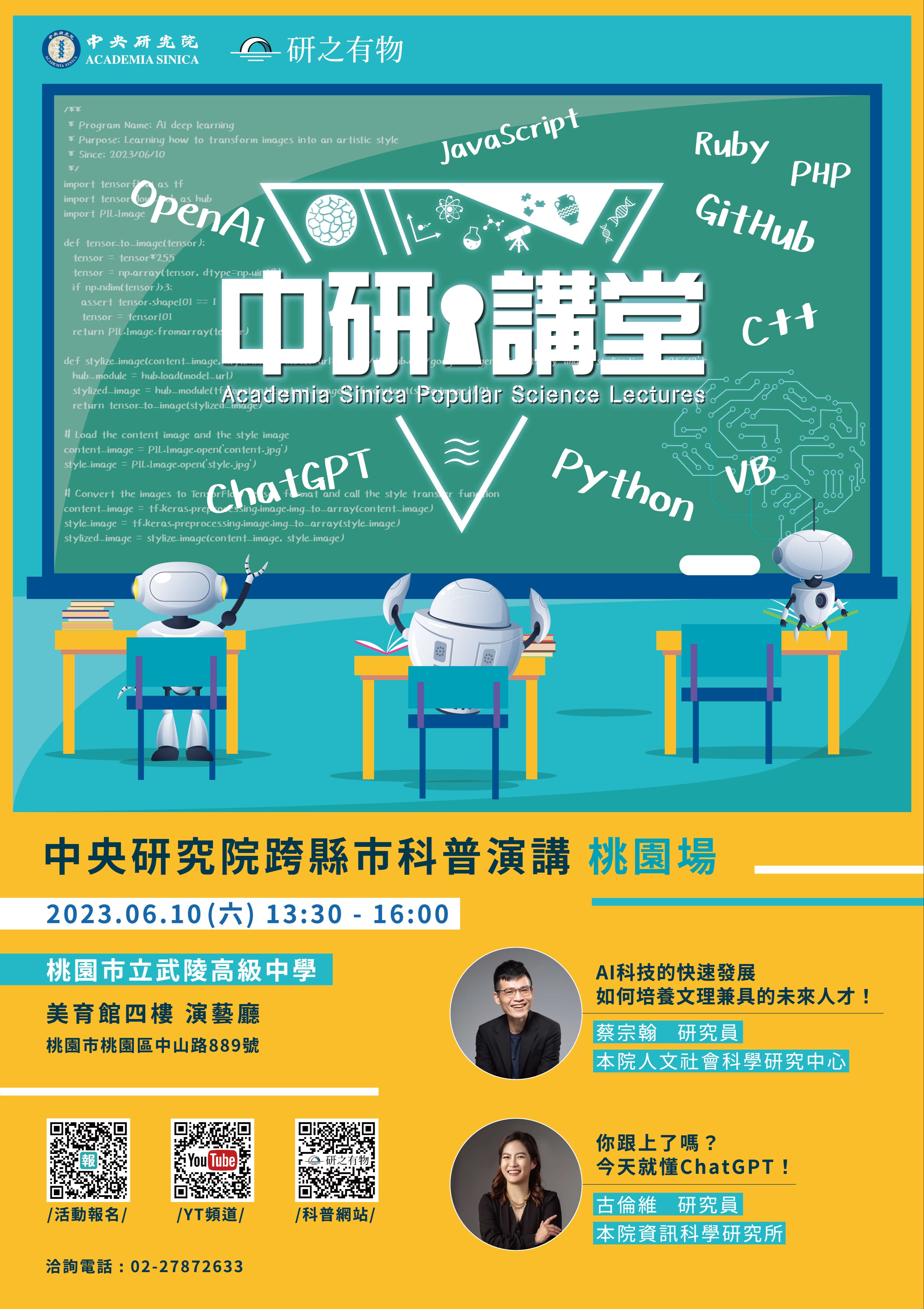 二、演講資訊: (一)日期:112年6月10日(星期六)。 (二)時間:下午1時30分至4時整。 (三)地點:桃園市立武陵高級中學美育館四樓演藝廳(桃園 市桃園區中山路889號)。 (四)主講人: 1、場次一:蔡宗翰研究員(本院人文社會科學研究中 心);講題「AI科技的快速發展,如何培養文理兼具 的未來人才!」。 2、場次二:古倫維研究員(本院資訊科學研究所);講 題「你跟上了嗎?今天就懂ChatGPT!」。