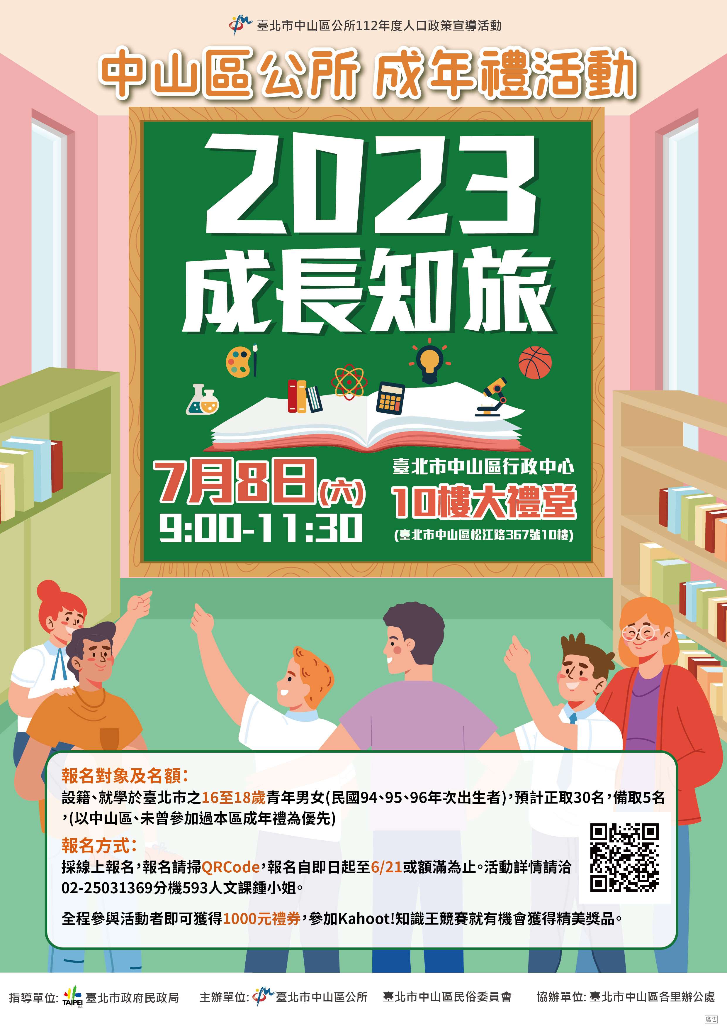 「臺北市中山區公所112年度成年禮活動『2023成長知旅』將於112年7月8日(星期六)上午9時舉辦,即日起開放報名至6月21日或額滿為止,歡迎設籍或就讀臺北市高中職、大專院校之16至18歲青年學子(民國94、95、96年次)踴躍報名參加!全程參加者可獲得1,000元禮券1份!詳細活動內容請參閱活動簡章。報名網址:https://forms.gle/EsDpHjyXDEggVne58。活動相關問題請洽(02)25031369轉593人文課鍾小姐。」
