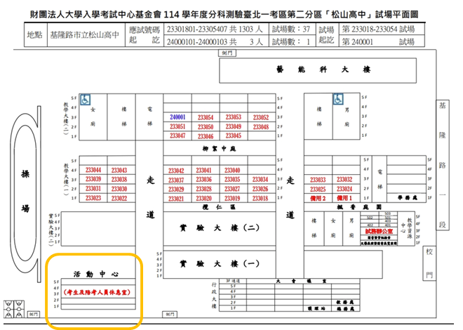 松山高中 活動中心 3樓 供考生休息(服務人員駐守其內,休息處空間有限,考生請多運用考