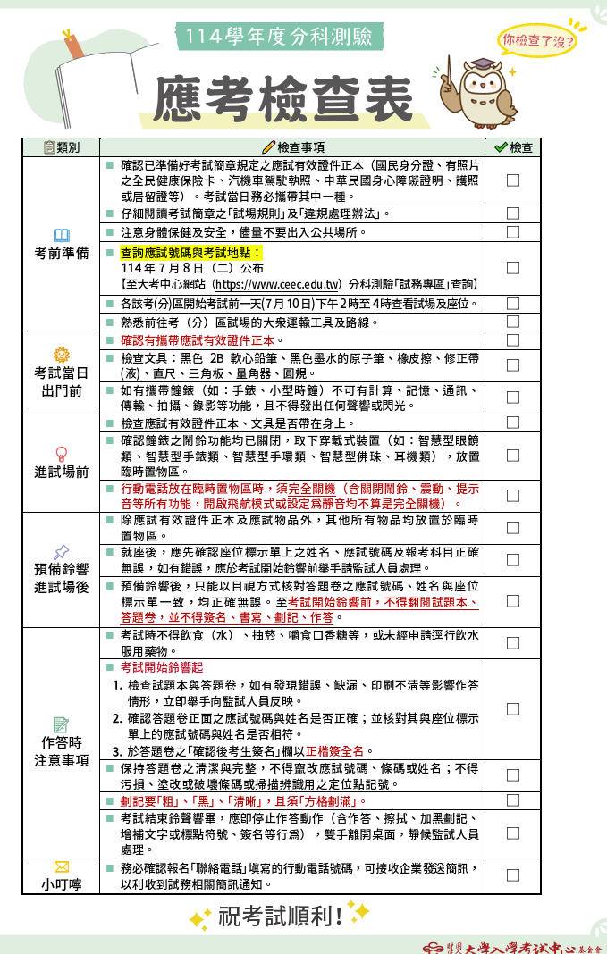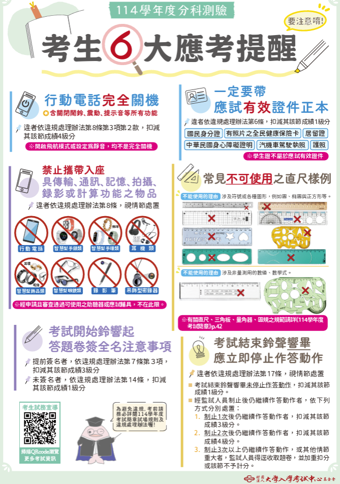 4.分科測驗不另發送准考證。請攜帶身分證、健保卡等任一有效證件