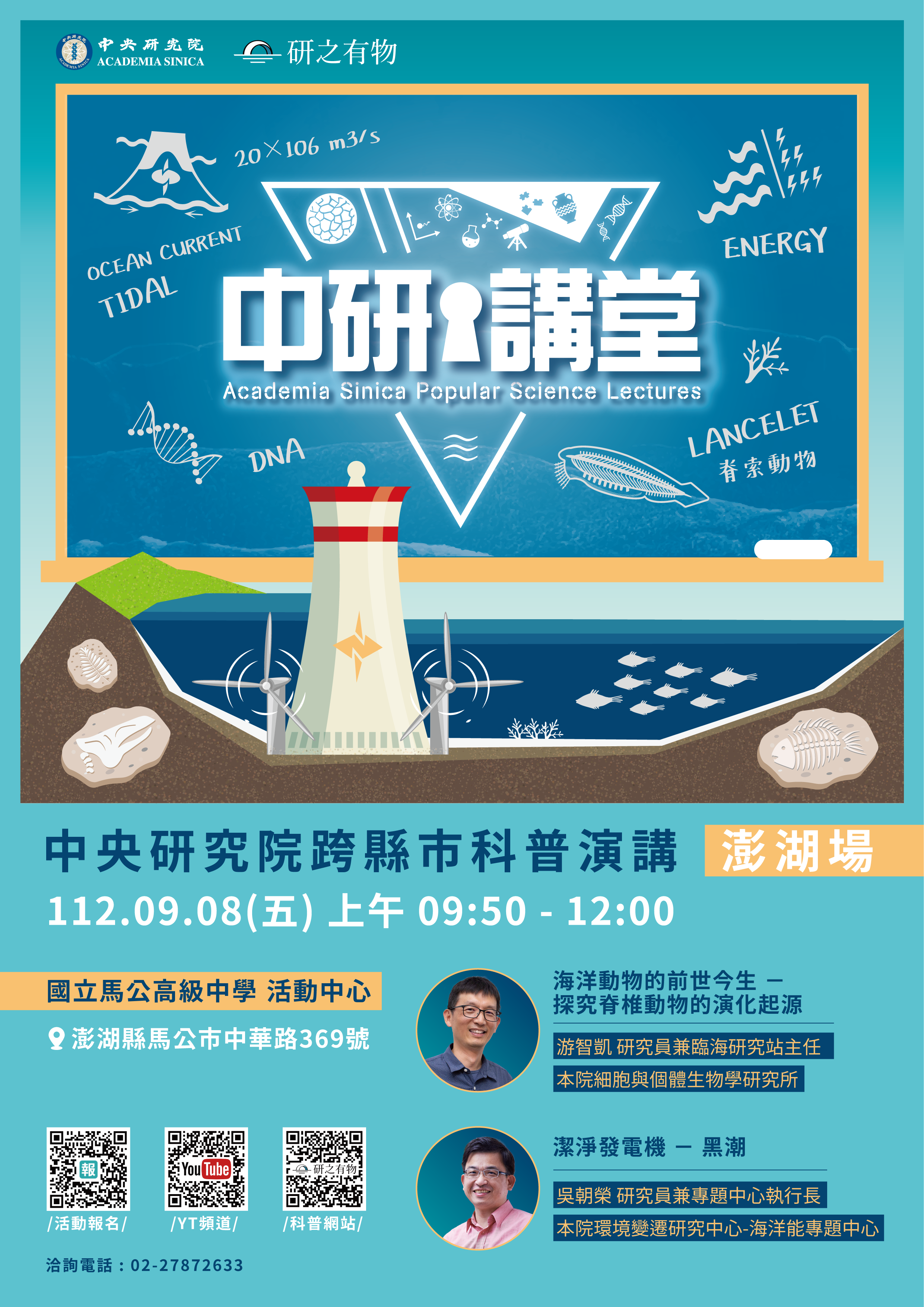 二、演講資訊: (一)日期:112年9月8日(星期五)。 (二)時間:上午9時50分至12時整。 (三)地點:澎湖馬公高中活動中心(澎湖縣馬公市中華路369 號)。 (四)主講人: 1、場次一:游智凱研究員兼臨海研究站主任(本院細胞 與個體生物學研究所);講題「海洋動物的前世今 生—探究脊椎動物的演化起源」。 2、場次二:吳朝榮研究員兼專題中心執行長(本院環境 變遷研究中心海洋能專題中心);講題「潔淨發電 機—黑潮」。