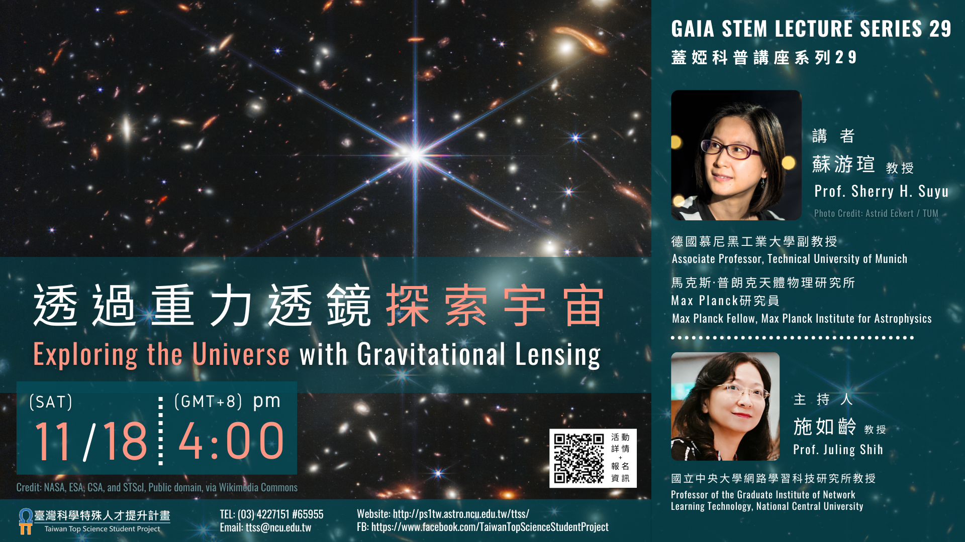 一、蘇游瑄教授使用引力透鏡現象來探索黑暗宇宙:暗能量、暗物質和超大質量黑洞。她也致力於觀察宇宙明亮的一面,從超新星那裡觀察絢爛的宇宙煙火。蘇游瑄教授領導了H0LiCOW計劃,該計劃使用引力透鏡類星體測量了我們宇宙的擴張速率。在歐洲研究委員會通過綜合補助金的支持下,她正在啟動一個關於透鏡超新星的新計劃。