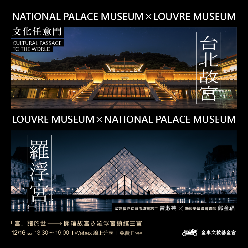 一、金車文教基金會邀請國立故宮博物院資深導覽志工曾淑 芸、藝術美學講師郭金福,分享故宮與羅浮宮建築之美, 及鎮館三寶隱藏版故事。透過雙講者的互動解說,帶領觀 眾跳脫時間與空間的藩籬,穿梭在法國、臺灣兩地,進行 東西方文化異同對比,以增進多元文化價值觀與國際視 野。