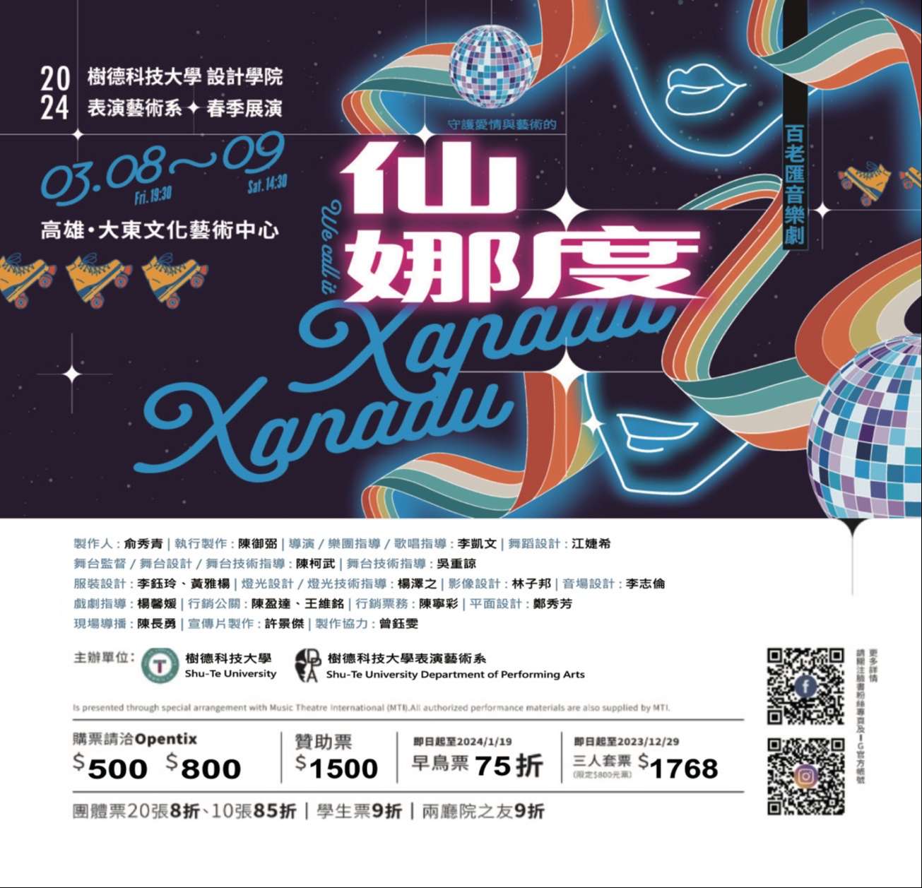 一、樹德科技大學表演藝術系春季展演百老匯音樂劇《仙娜度 XANADU》將於113年3月8日(五)以及3月9日(六)於高雄大東 文化藝術中心演出,今年春季展演由製作人俞秀青、美籍 導演李凱文以及業界各領域專家老師指導,帶領全體表藝 系大三學生共同製作。此次演出為亞洲首演,以經典重 現,從百老匯買進版權,劇情改編自經典電影《仙娜度的 狂熱》,講述繆斯女神與凡人突破困境相戀及創造藝術的 故事,內容結合希臘神話及disco元素,並加入現場樂團、 集結各種舞風以及劇場少見的滑輪鞋元素,為觀眾帶來精 彩絕倫的視覺饗宴,樹德科技大學表演藝術系誠摯邀請您 前往蒞臨觀賞與指教,給予最大的支持與鼓勵。