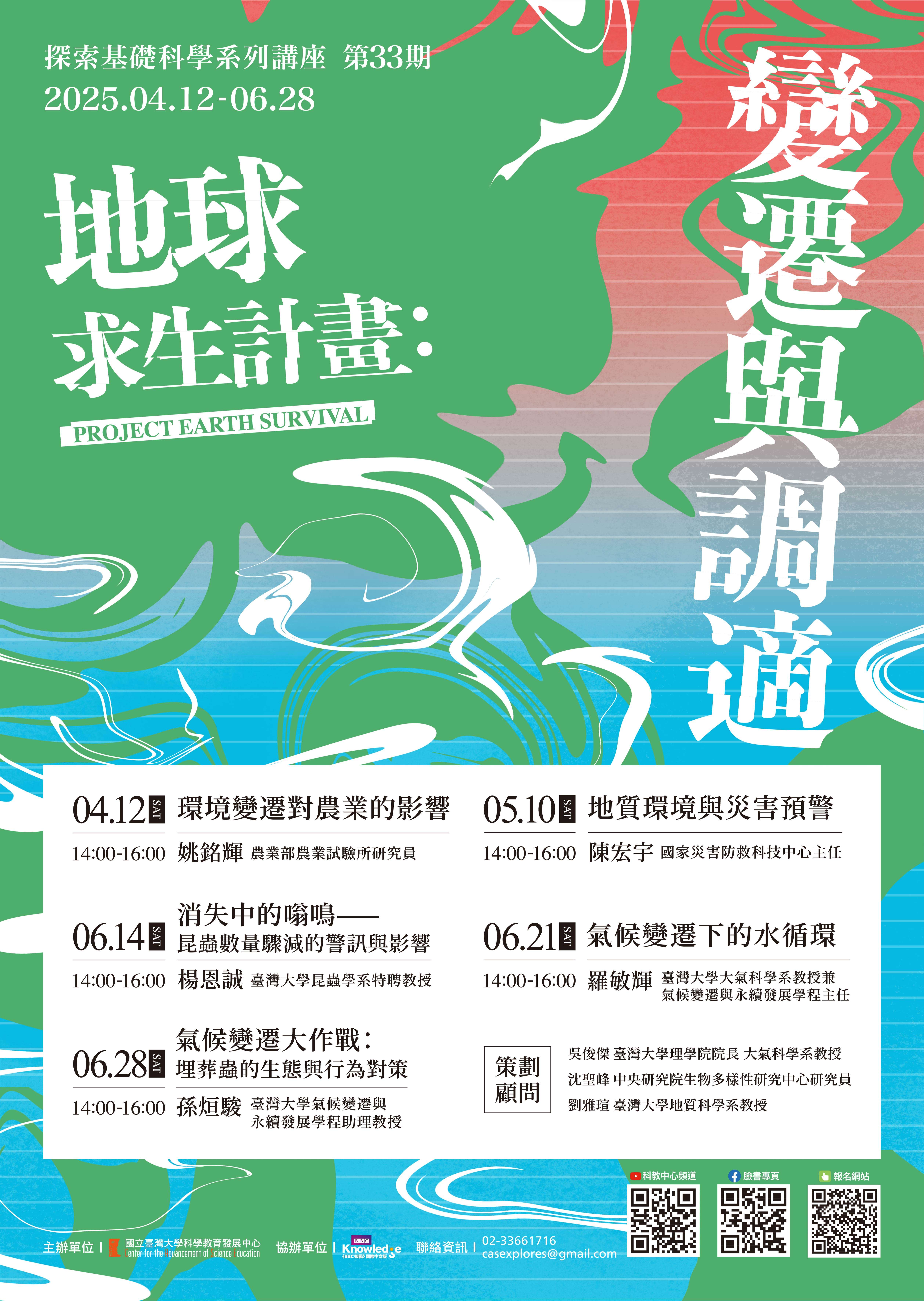 二、本期以環境變遷為主軸,邀請大氣、農業、防災及生物領域專家學者,以科學視角剖析環境變遷在不同面向的影響和考驗,並探討人類如何攜手應對。自114年4月12日至6月28日止,共辦理5場,場次及主題如下:(詳如附件)