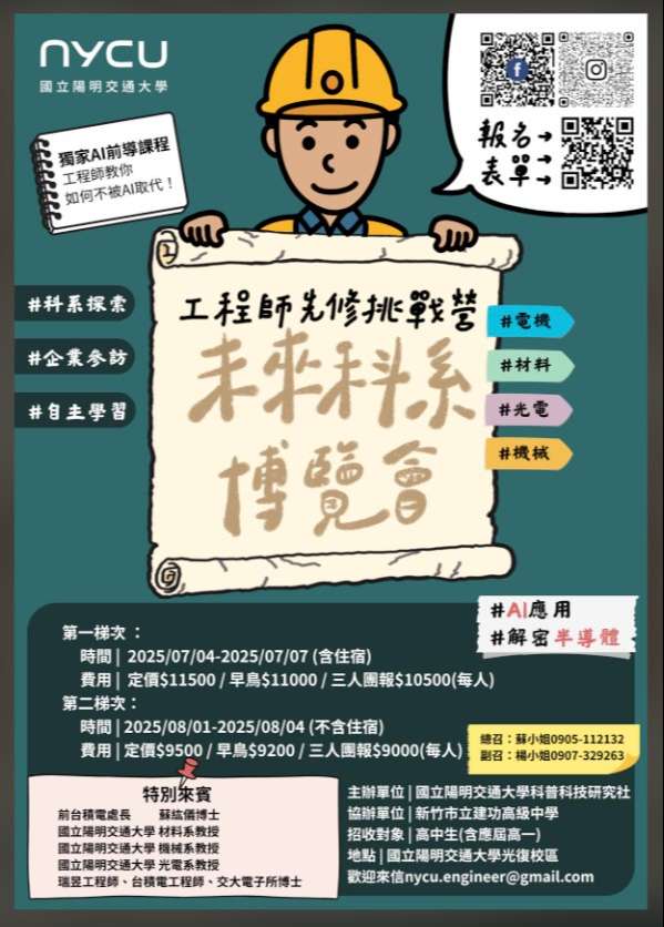 國立陽明交通大學學生社團科普科技研究社舉辦「2025工程師先修挑戰營—未來科系博覽會」,歡迎同學踴躍報名參加