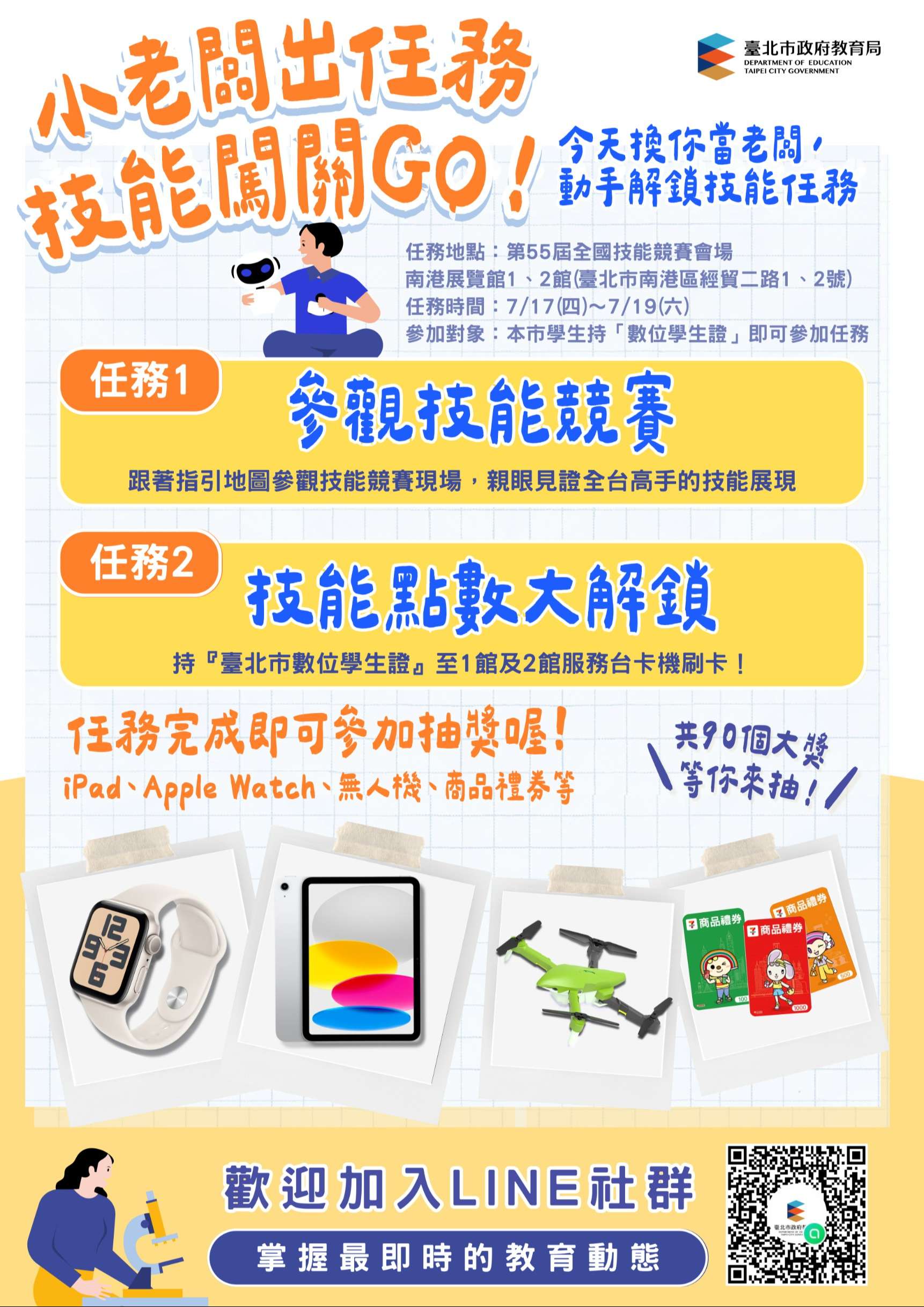 二、現場提供本市學生限定好禮抽獎活動,凡本市各級學校學生參觀技能競賽,並持「數位學生證」至南港展覽館1館及2館大會服務臺教育局卡機刷卡即可參加抽獎,獎品包括平板電腦、智慧手錶、無人機及商品禮券(1000元、500元、100元不等),高達90位獲獎名額。