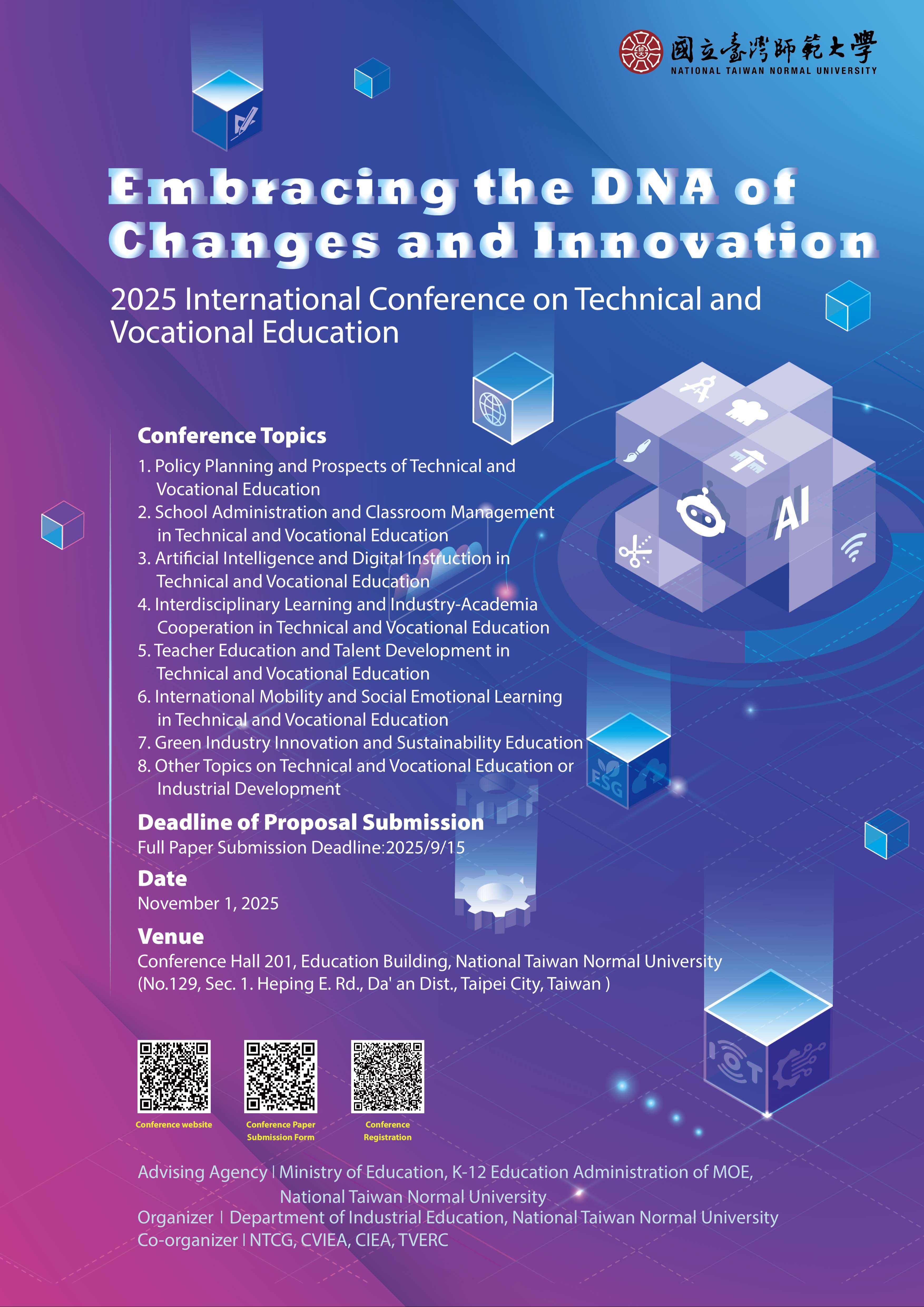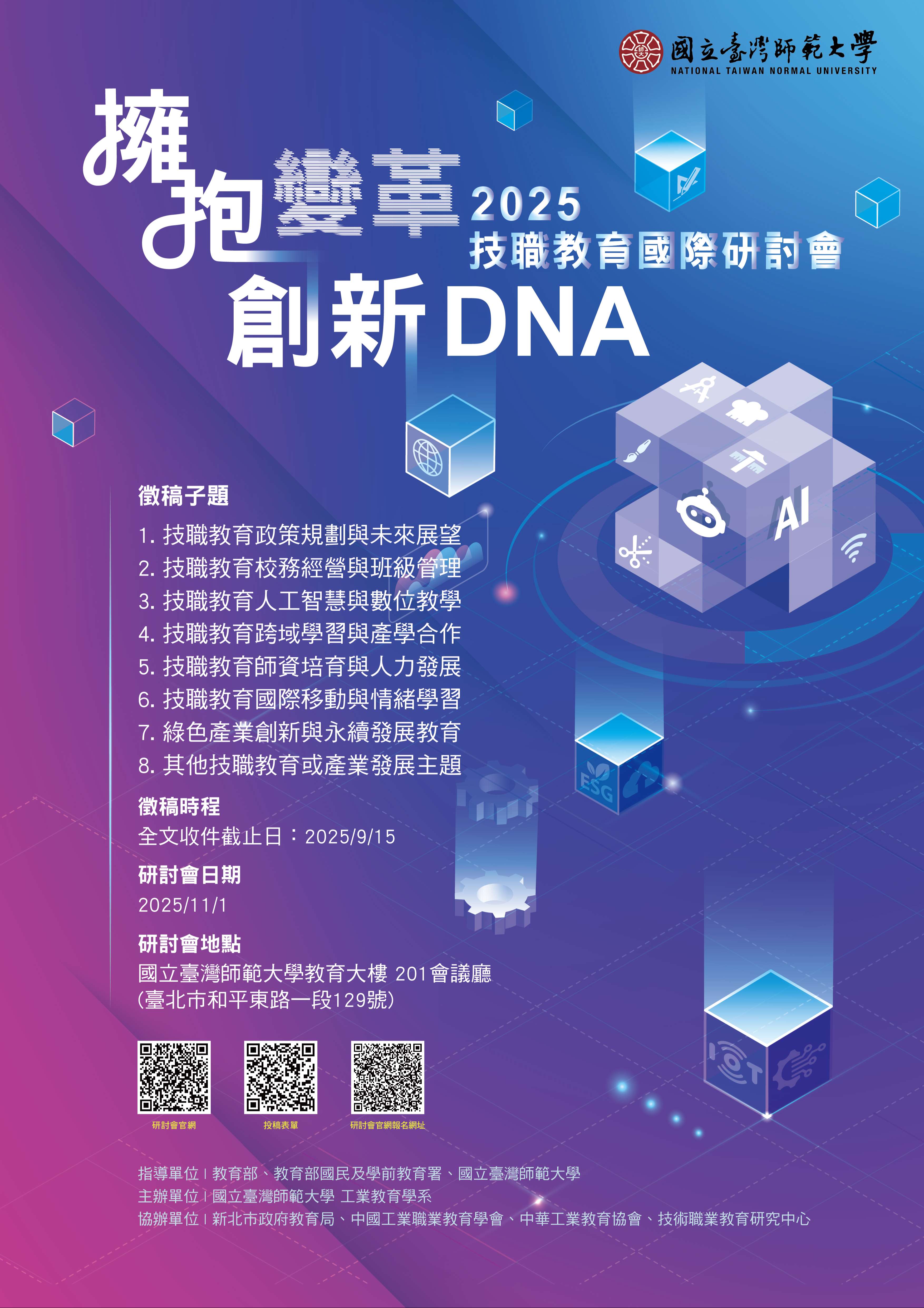 二、論文全文投稿截止日期至2025年9月15日(星期一)止。論文發表徵稿辦法請見國際研討會官網(https://ntnu-tve.cityweb.com.tw/2025/include/index.php) 查詢,敬邀師生踴躍投稿。