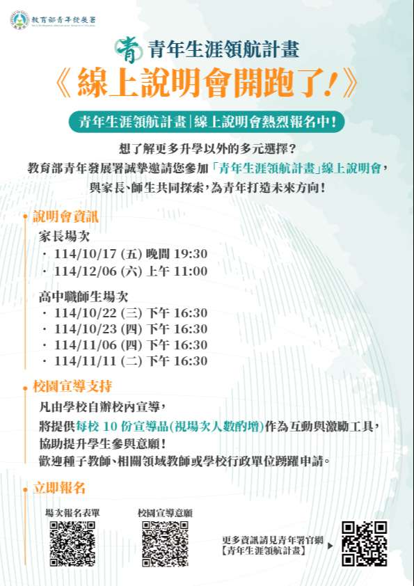 為讓家長深入了解本計畫內涵,教育部青年發展署將於114年10月17日(星期五)晚間7時30分及12月6日(星期六)上午11時辦理家長線上說明會,請參閱活動eDM(附件1)