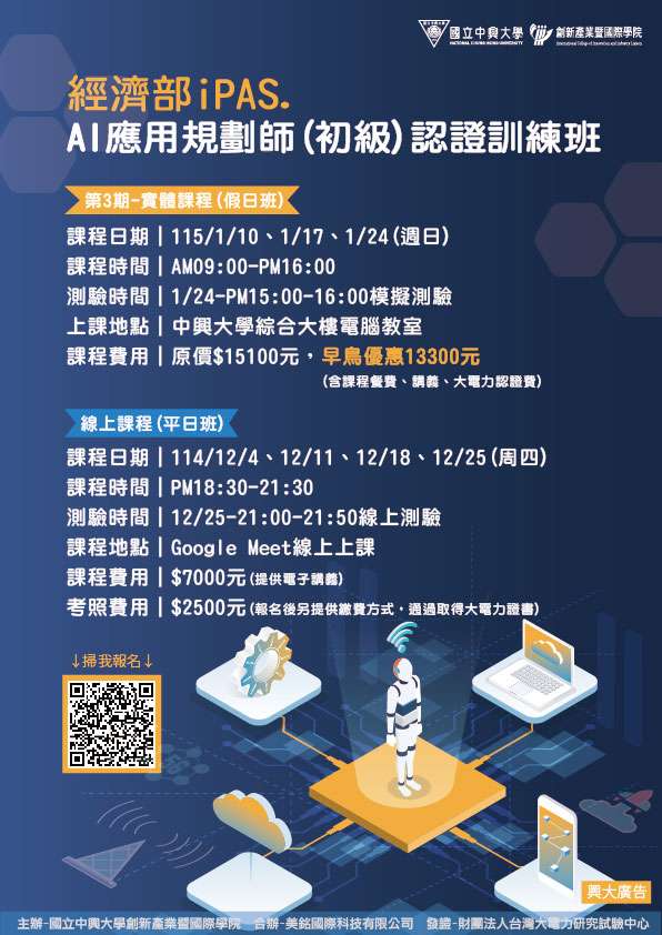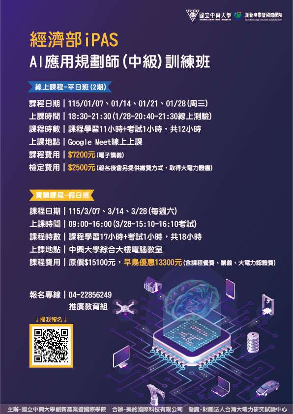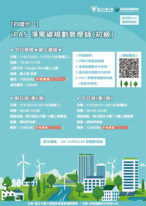 國立中興大學辦理「四證合一-經濟部 iPAS 淨零碳規劃管理師(初級)輔導考證班、經濟部iPAS-AI應用規劃師(初級、中級)輔導訓練班」招生訊息,即日起開放報名
