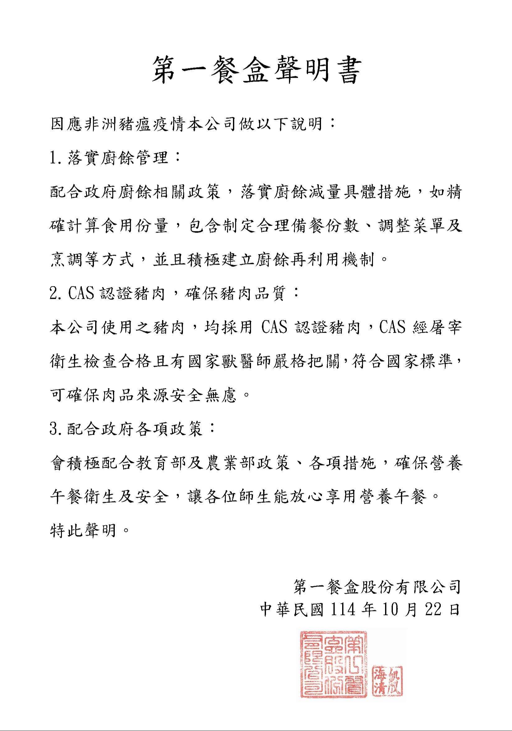 因應豬瘟事件,本校邀請第一及上將兩家桶餐廠商提供相關說明,讓師長、家長及同學放心用餐。