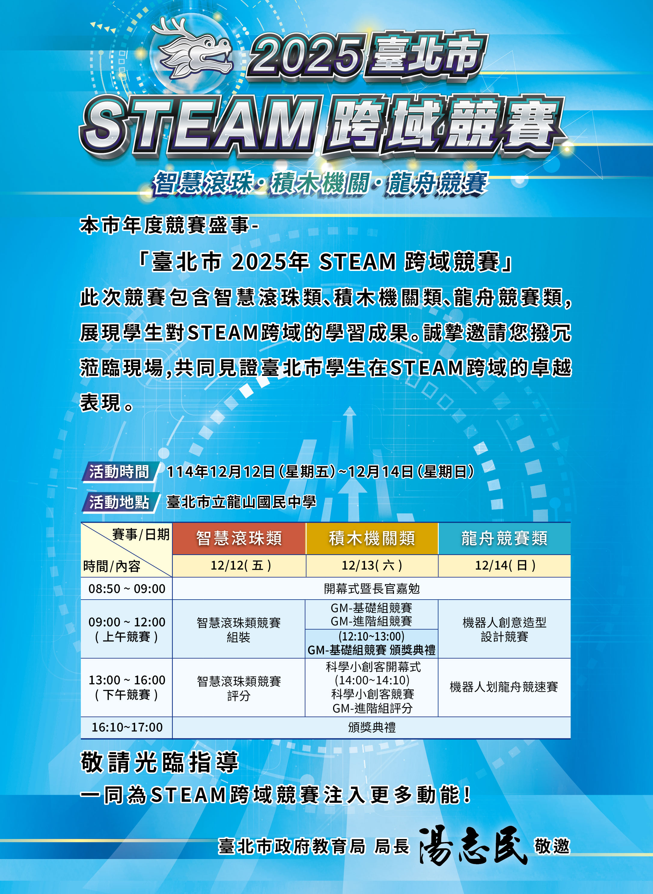 「臺北市2025年STEAM跨域競賽」暨頒獎典禮於114年12月12日(星期五)至12月14日(星期日)舉辦,歡迎大家參加!