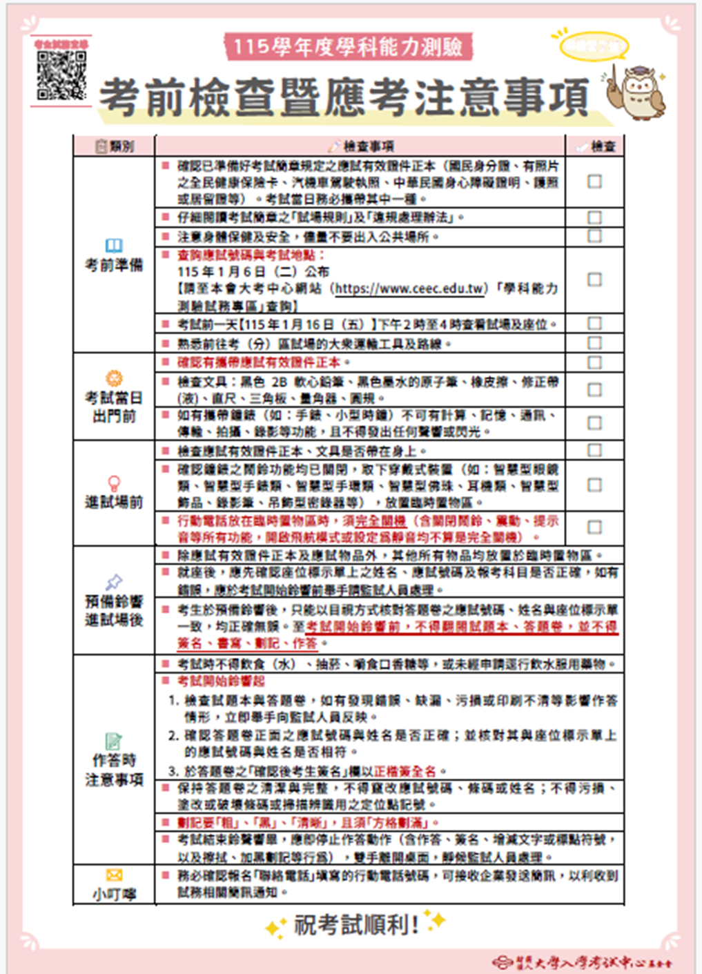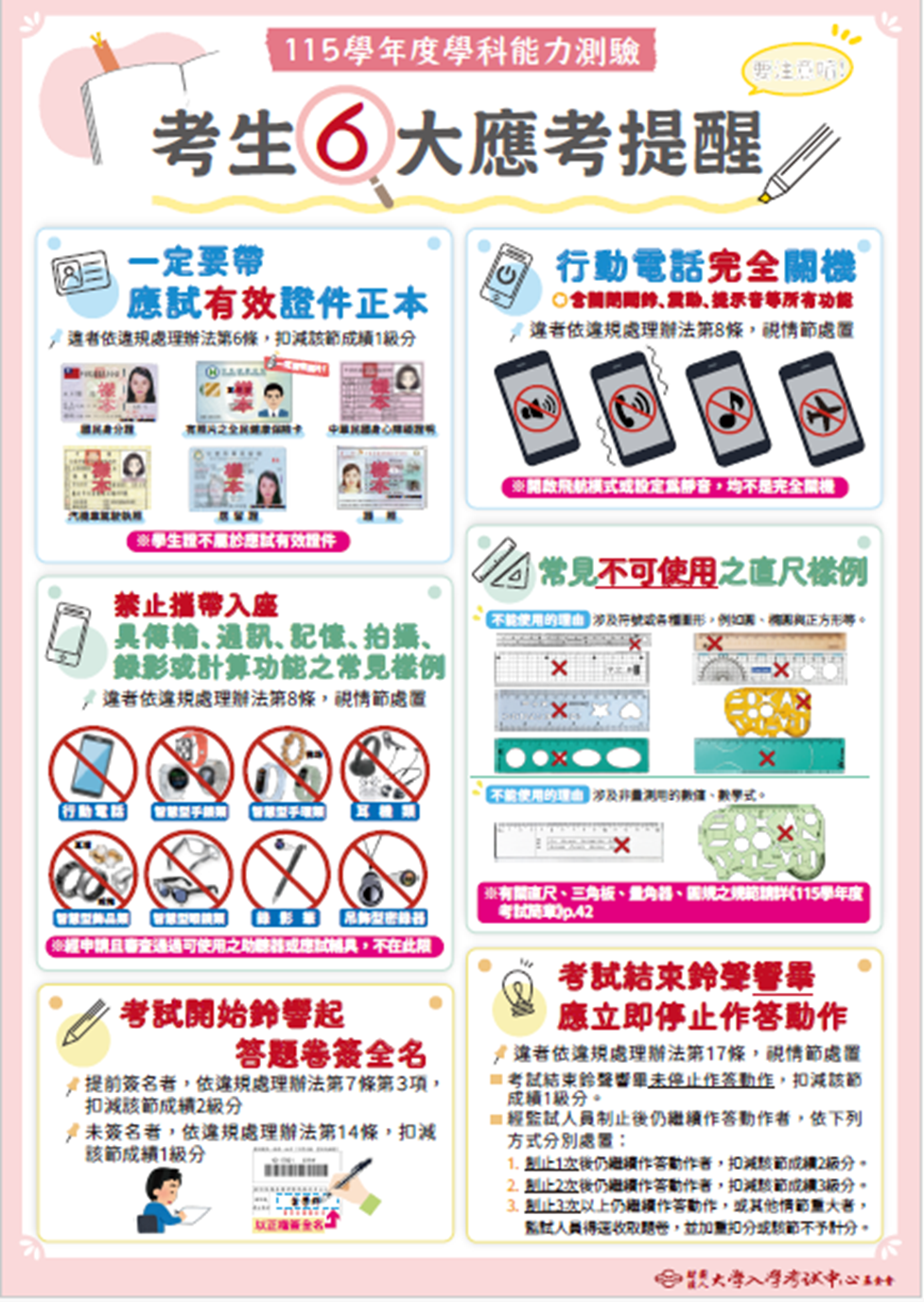 1.請務備妥考試時的必需物品,「有效證件~身分證或健保卡、護照、居留證、駕照」、「2B 鉛筆」、「橡皮擦」、「黑色原子筆」、「透明墊板」、以及「修正液(帶)」。另外,衛生紙、手錶(教室無時鐘,常以手機當手錶之同學務必留意),以及直尺、圓規、三角板、量角器等數學工具。
