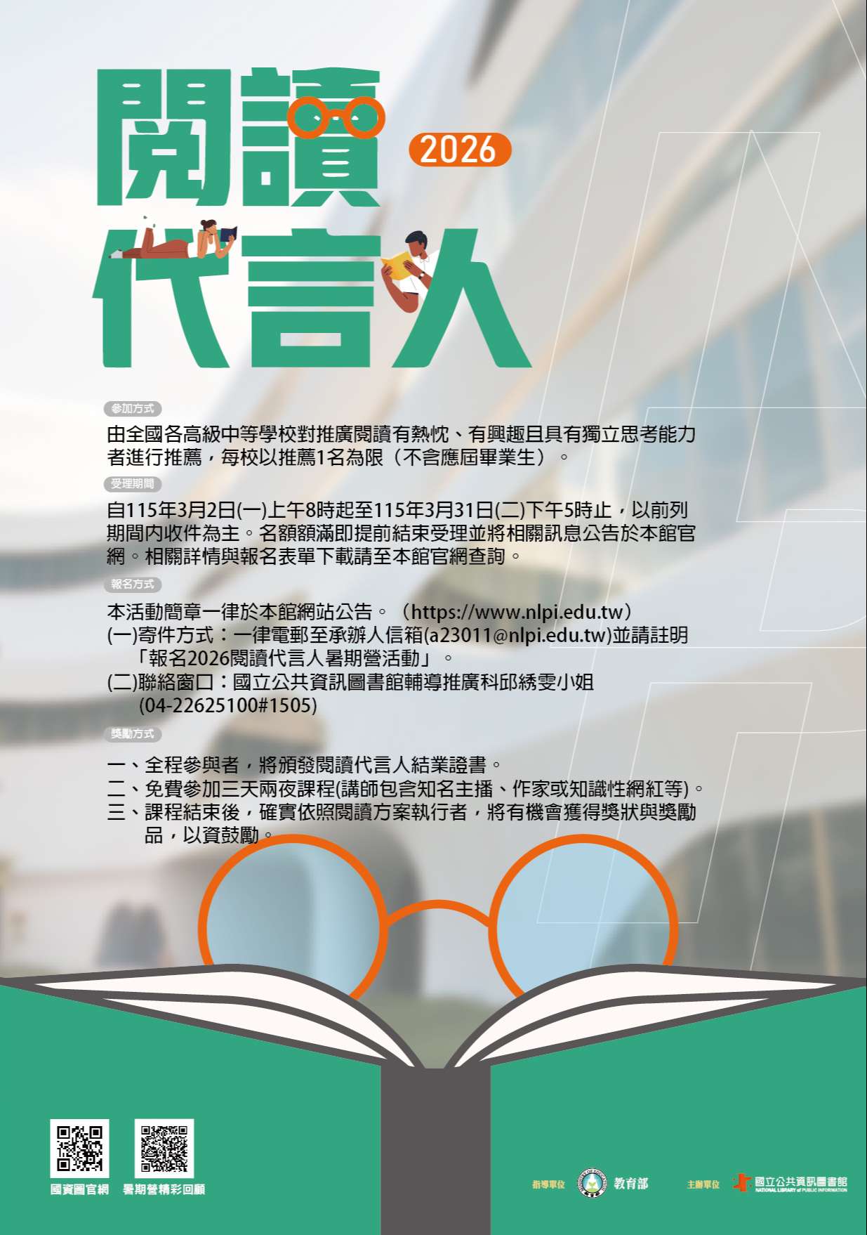 (二)收件方式:一律採電子郵件報名,請於前列期間內將報名資料表、學生證影本及同意書以電子郵件傳送至國立公共資訊圖書館承辦人信箱(a23011@nlpi.edu.tw),名額額滿即提前結束受理。