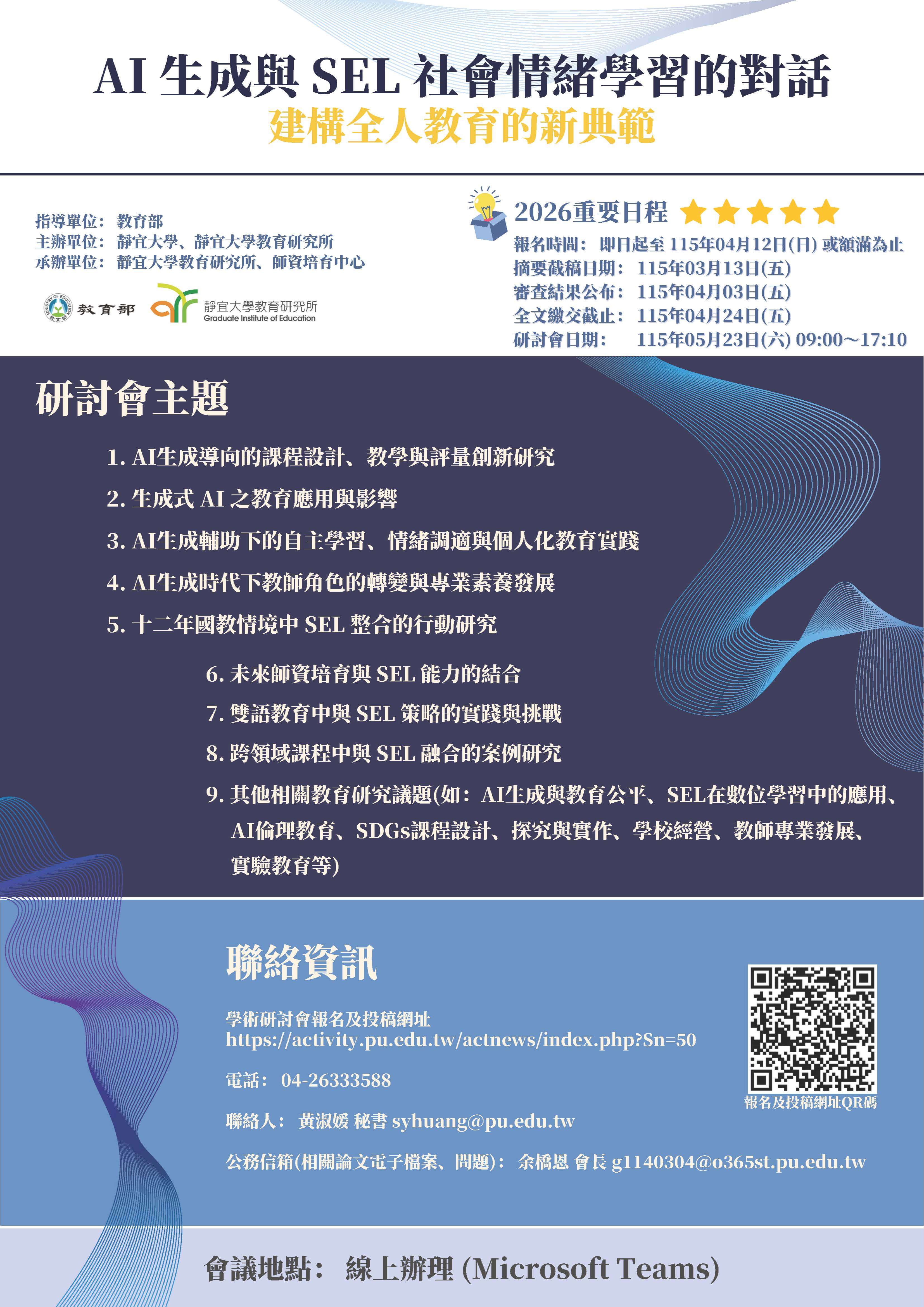 四、研討會計畫書及海報詳如附件,研討會主題、投稿須知、報名等相關訊息,請至本研討會網址:https://activity.pu.edu.tw/actnews/index.php?Sn=50查詢。