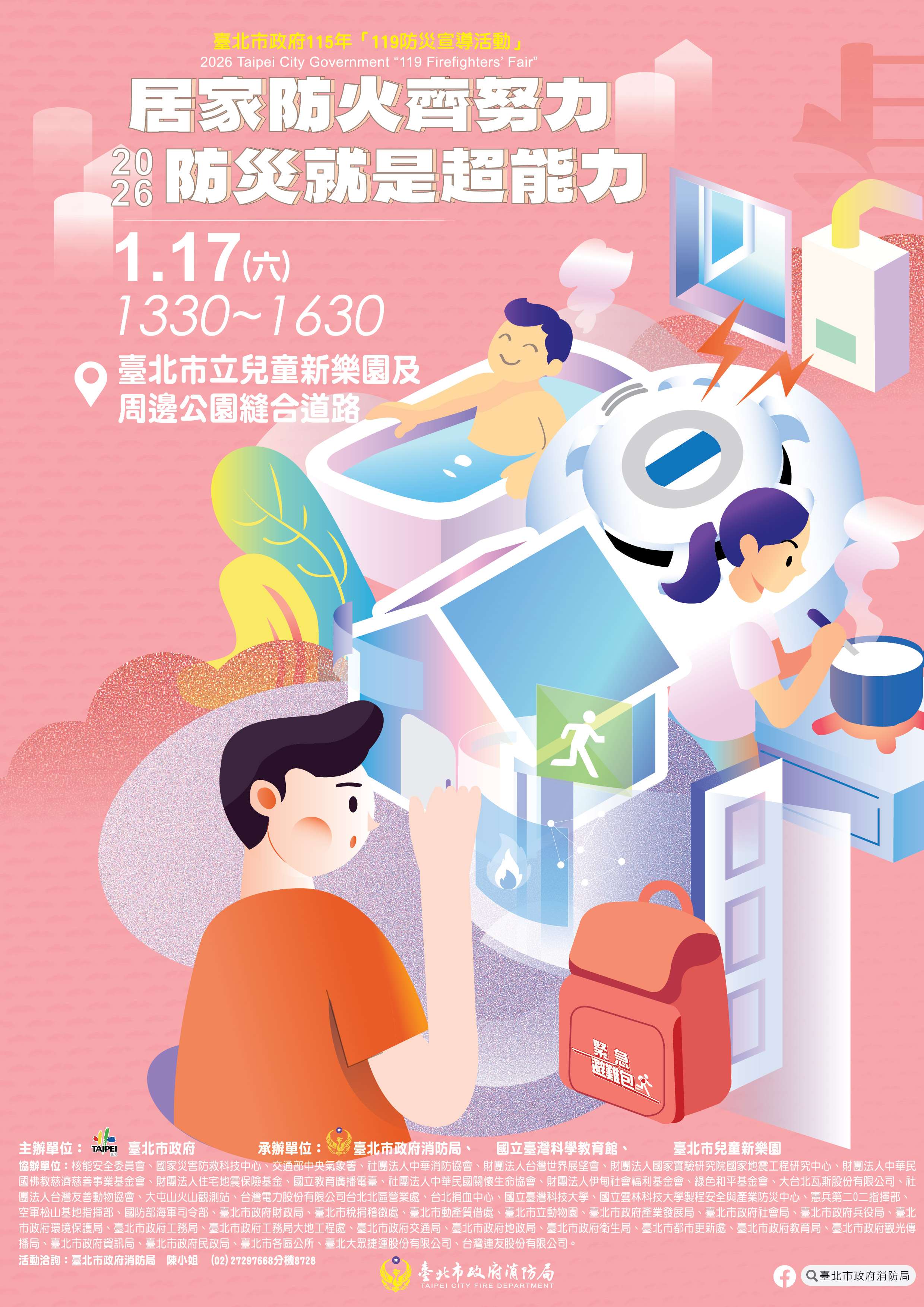 2026年1月17日星期六下午一點半,臺北市119防災宣導活動在科教館和兒童新樂園舉辦!現場有闖關遊戲、消防體驗、樂樂見面會,歡迎來挑戰闖關拿禮品,學習防火防災知識,全家一起擁有防災超能力!