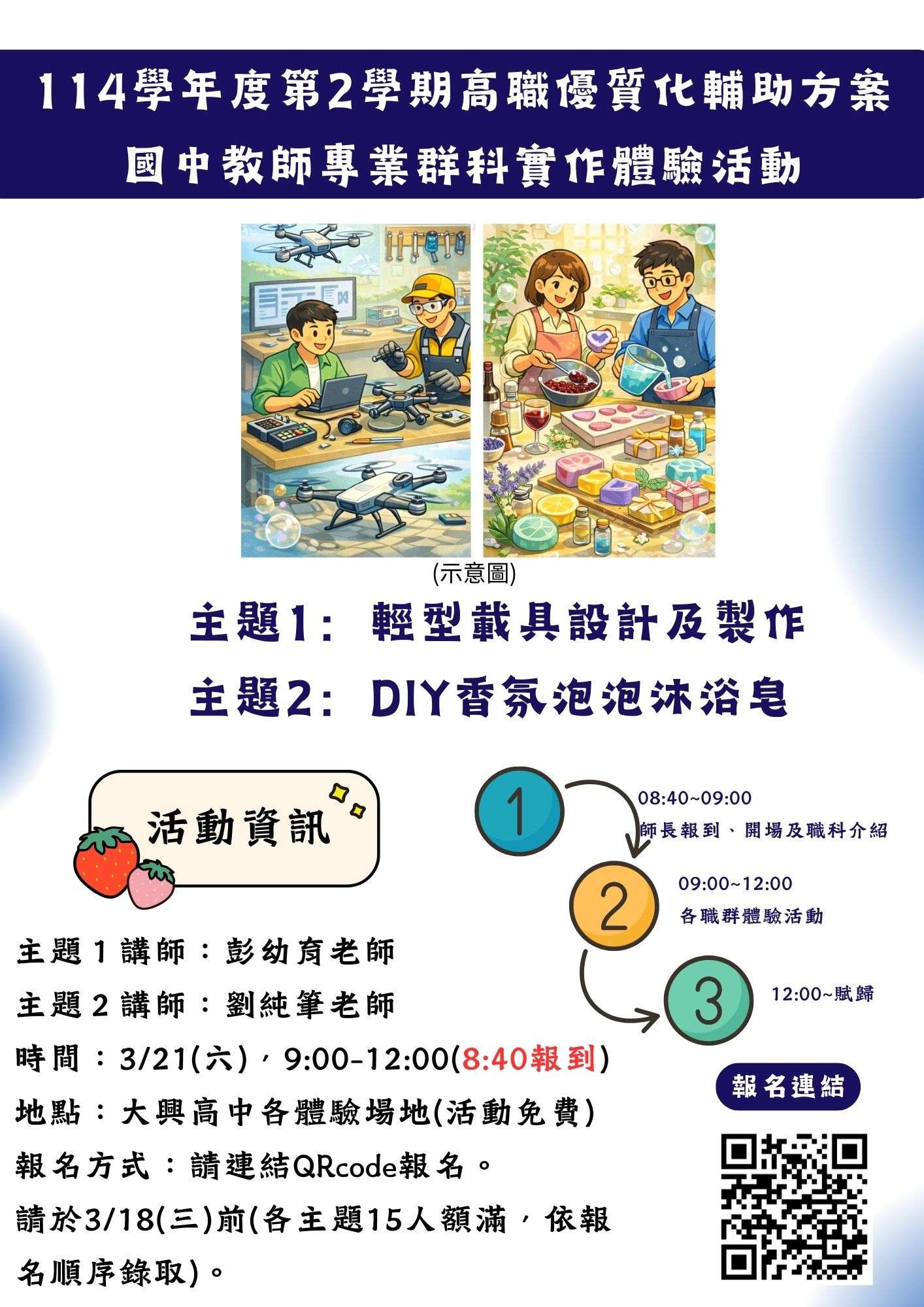五、活動內容:動力機械群-主題:輕型載具設計及製作。家政群-主題:DIY香氛泡泡沐浴皂。