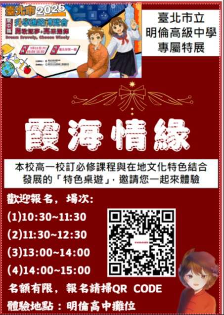 (二)活動地點:博覽會會場(臺北世貿一館) 普高25號攤位明倫高中展區。