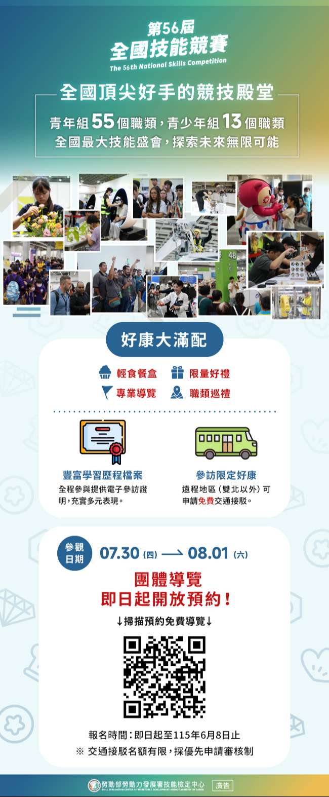 一、旨揭競賽活動訂於115年7月29日(星期三)至8月2日(星期日)假臺北南港展覽館1、2館(臺北市南港區經貿二路1、2 號)舉辦,本次辦理青年組55職類與青少年組13職類,共計68職類,為職業訓練與技職教育之年度盛事,