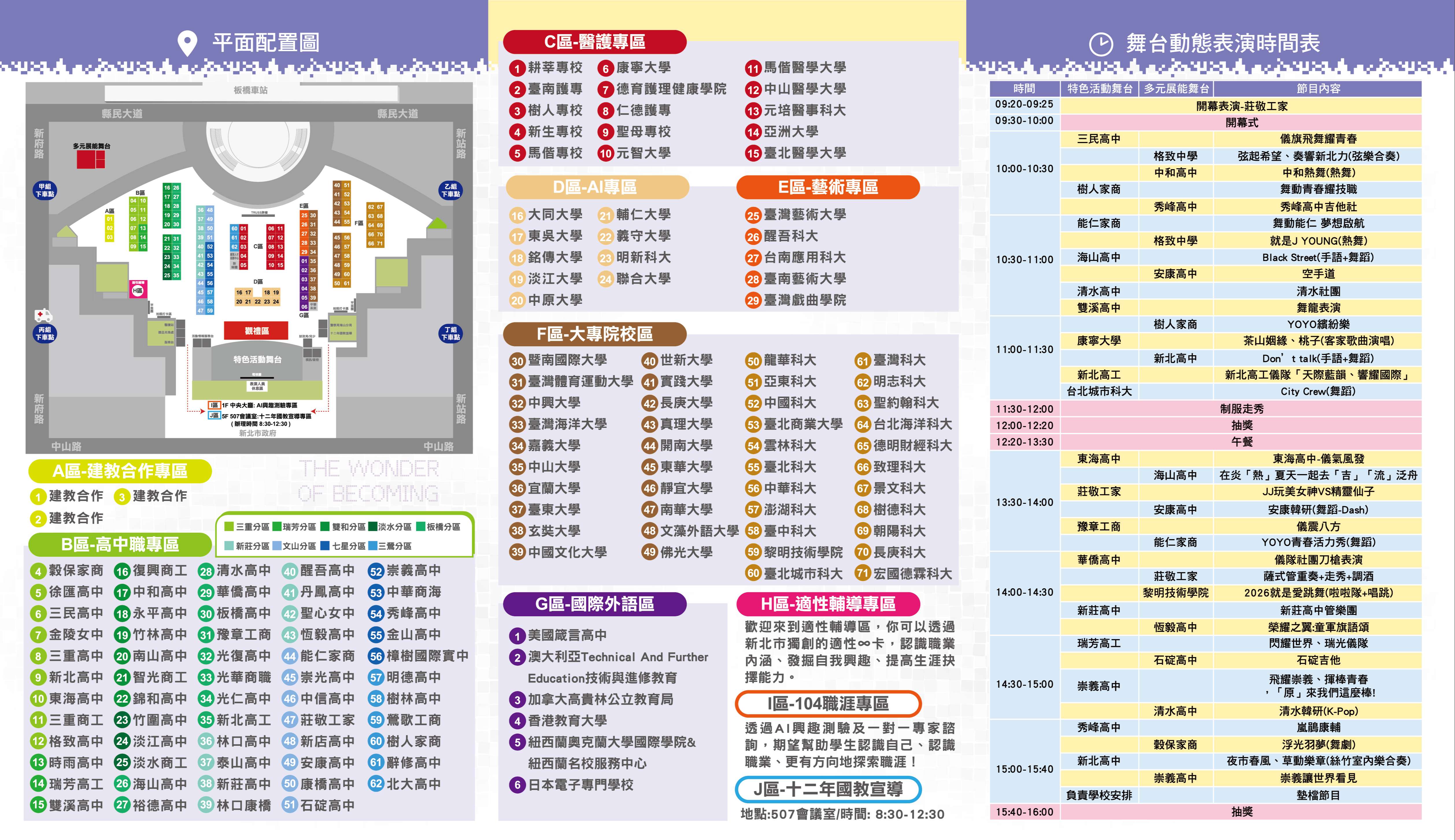 二、本次博覽會擴大邀請全國71所大專院校及60所新北市優質高中職學校參與,共有超過130所學校特色課程體驗,並設有十大專區體驗,涵蓋建教合作專區、高中職專區、醫護專區、AI專區、藝術專區、大專院校專區、國際外語專區、適性輔導專區、104職涯專區及十二年國教宣導專區等,另安排超過30個精彩的表演節目,歡迎北北基桃國高中學生及家長來現場參加,瞭解新北市優質高中職學校及大專院校特色。