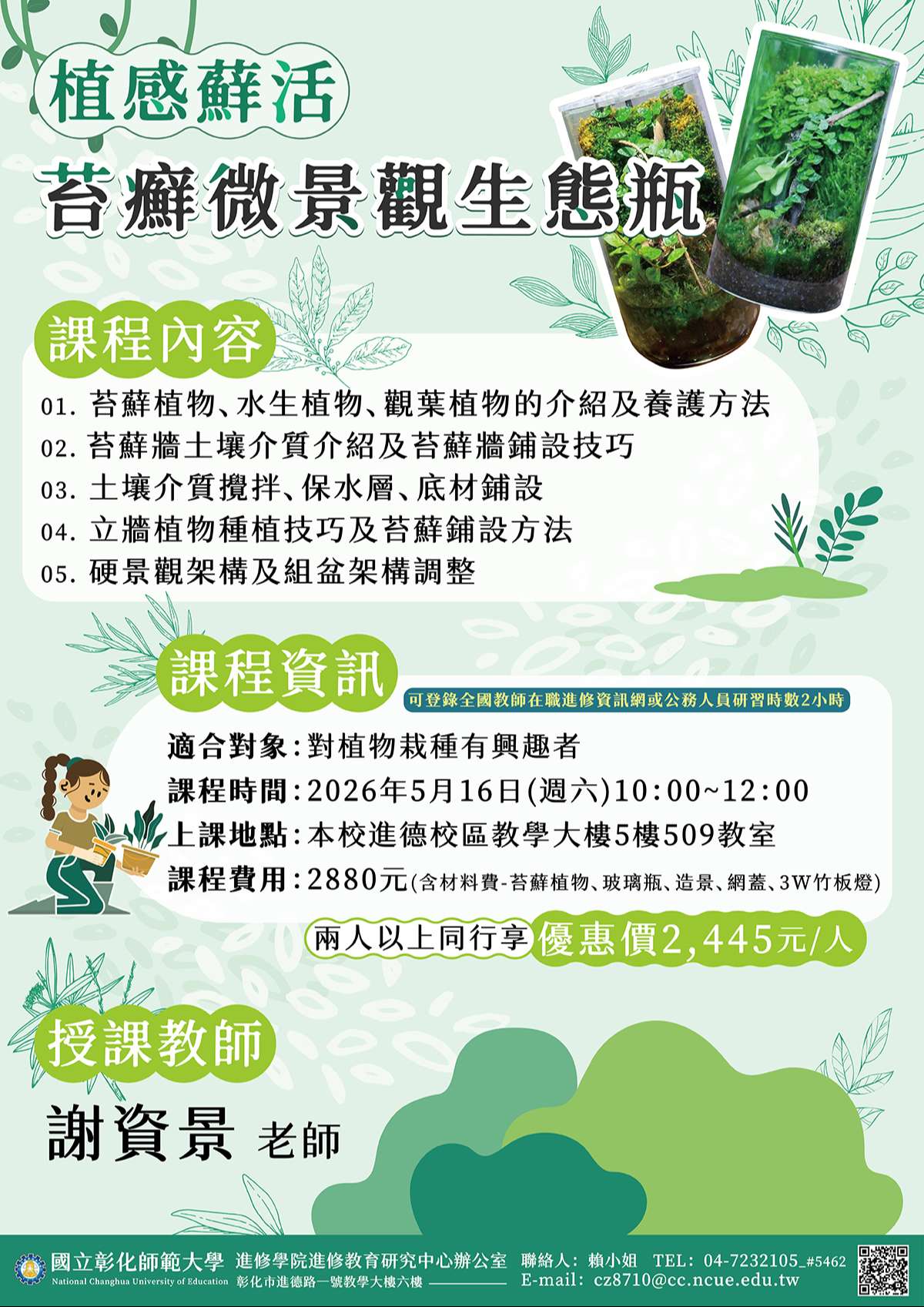 (三)課程費用:2,880元(含材料費-苔蘚植物、玻璃瓶、造景、網蓋、3W竹板燈) ,兩人以上同行或於115年03月31日前早鳥報名享優惠價每人2,445元。