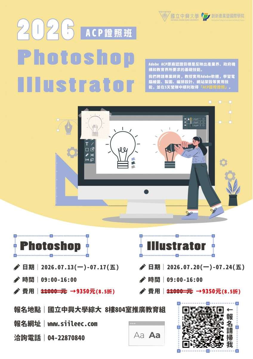 三、本校同步推出多項暑期熱門課程與證照輔導,包括 「Python程式系列」、「人工智慧工程素養認證輔導」、 「ACP國際證照-Photoshop與Illustrator考照班」、「SSE色彩學證照輔導」及「CCS生成式AI基礎能力認證 班」等,內容結合理論與實作,適合國高中生探索興趣並 強化專業能力。