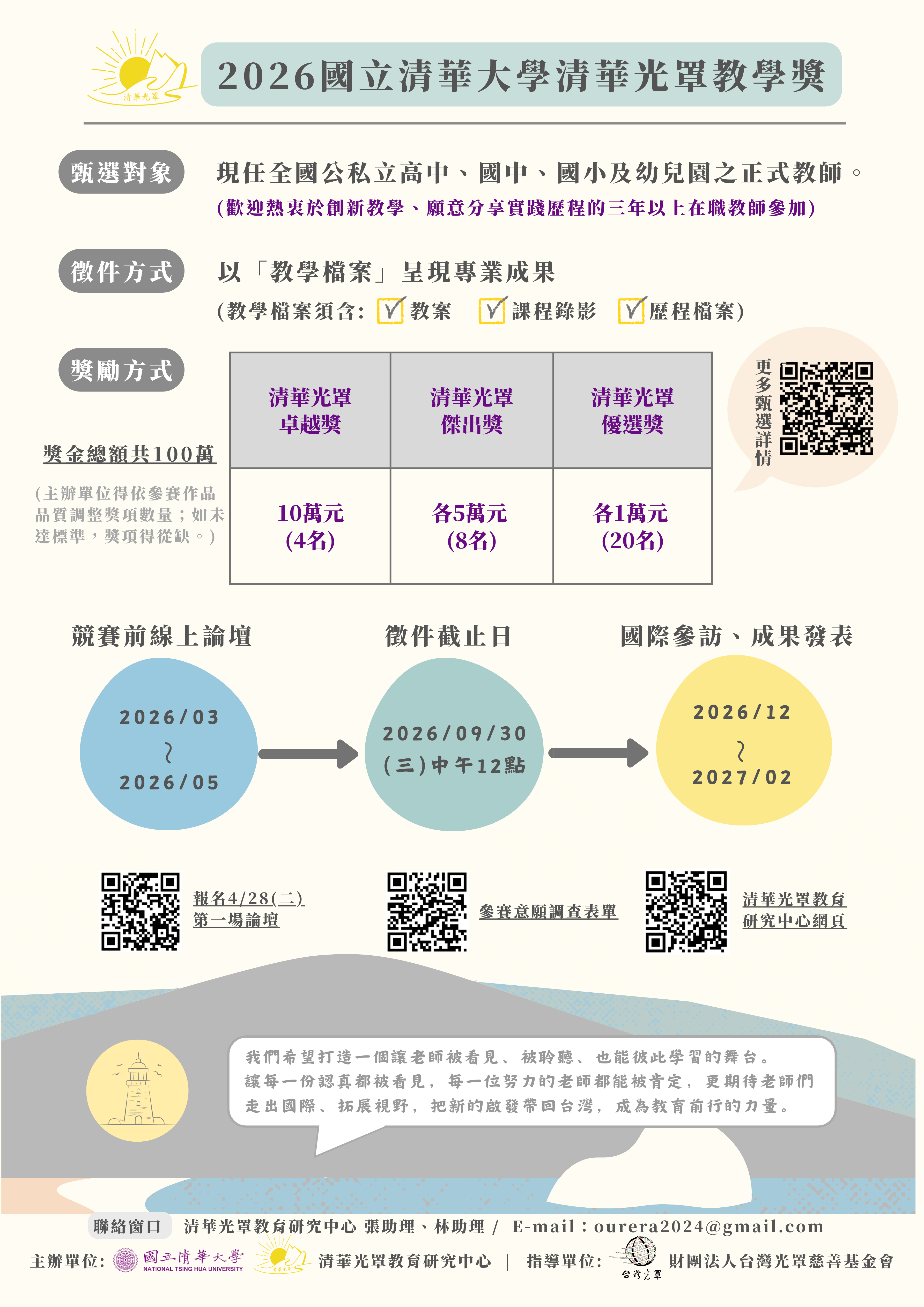 【公告】清華光罩教育研究中心辦理「2026國立清華大學清華光罩教學獎」甄選,敬請教師踴躍參與。