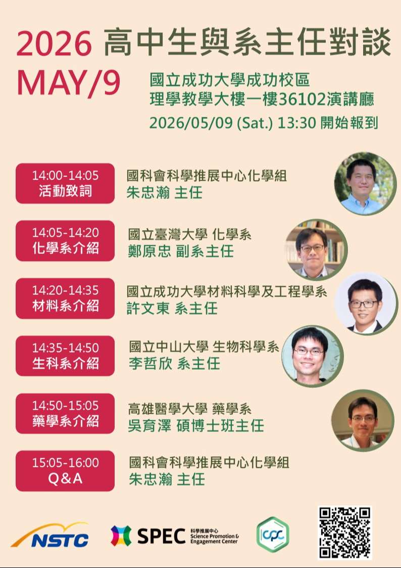 本次座談將邀請了化學、材料、生科、藥學等科系系主任 一同與會進行相互交流,對將來升學目標有更清晰的規 劃,使得高三學生更能孰悉各科系的課程特色與人才培育 目標、甄試入學的方向及畢業後的工作前景與展望。